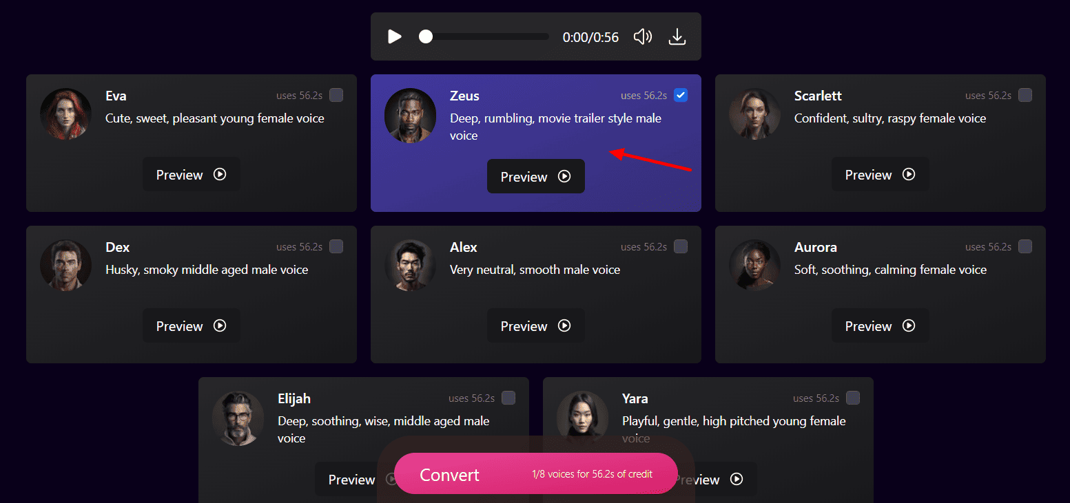 You get to choose from a limited library of 8 professional AI voices. A brief description of the voice type is mentioned under each voice. They can be previewed before you use them on your audio. However, you won’t find any customization options like speed, pitch shift, etc.