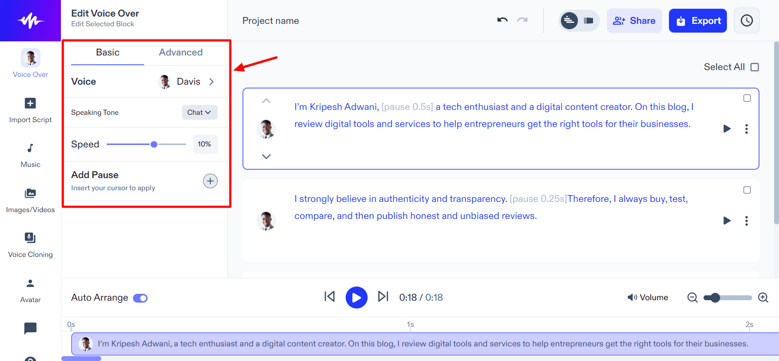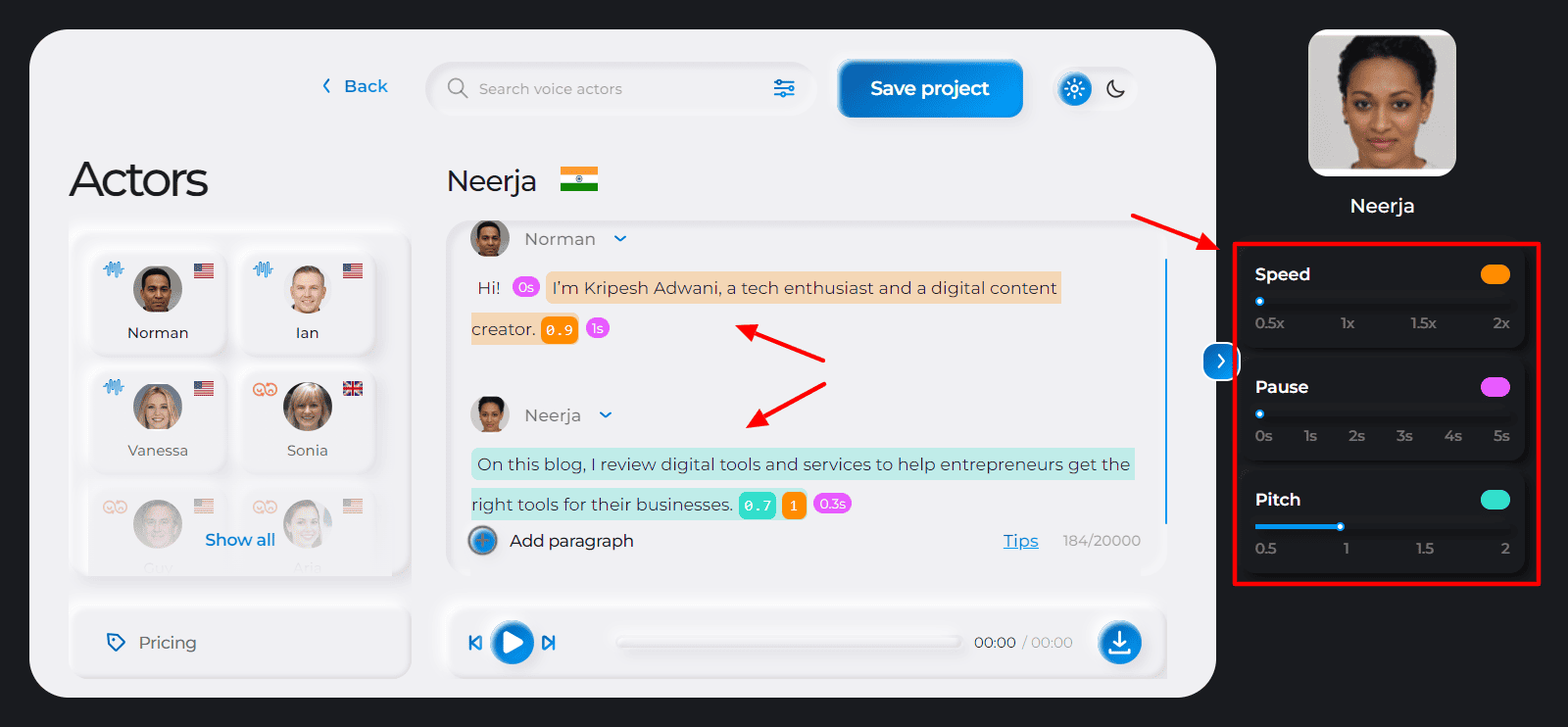 You can choose your language and pick an avatar from the Pro Voices, Rapid Voices, and Global Voices, or create a clone of your voice. On the editing screen, you can keep on adding multiple speakers and paste the content you want them to recite along with the speed.