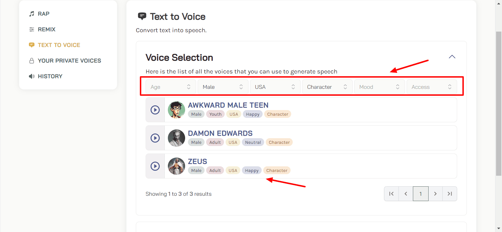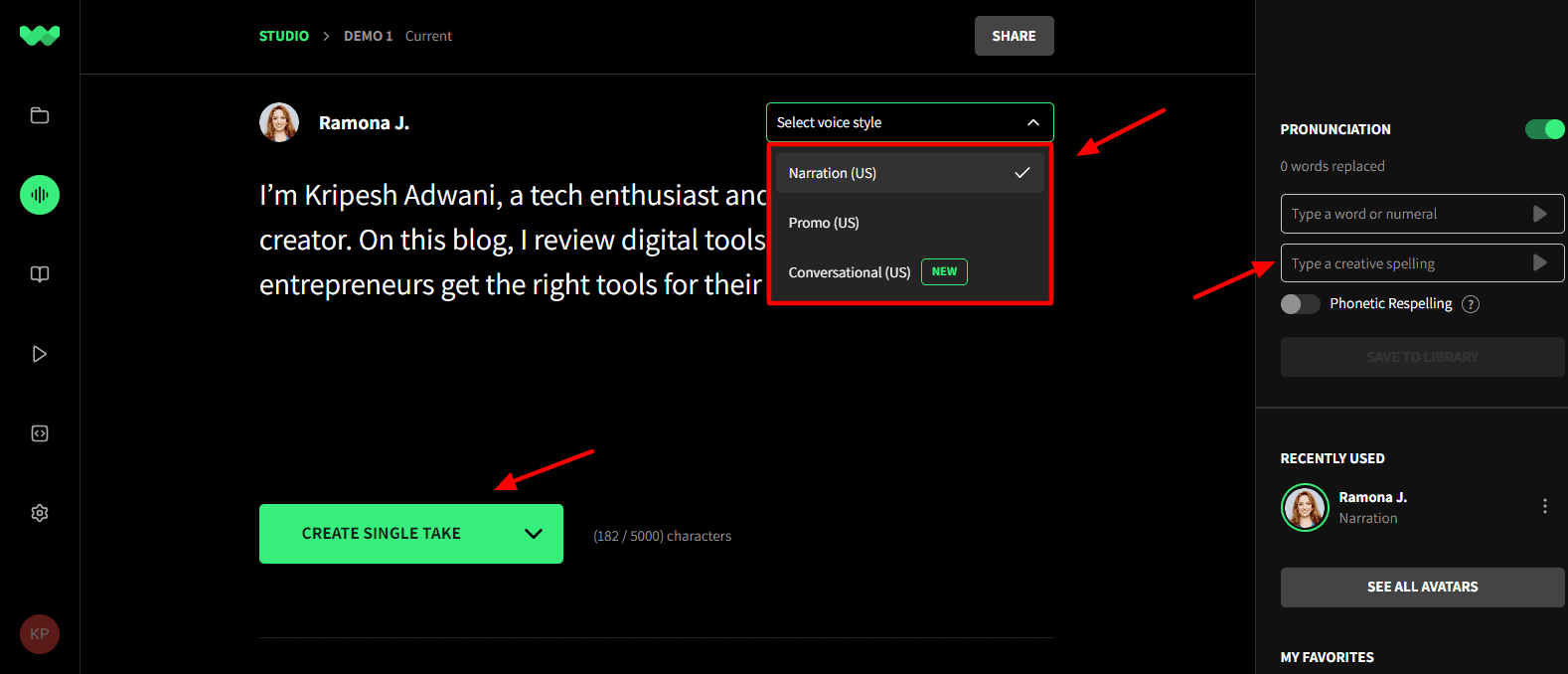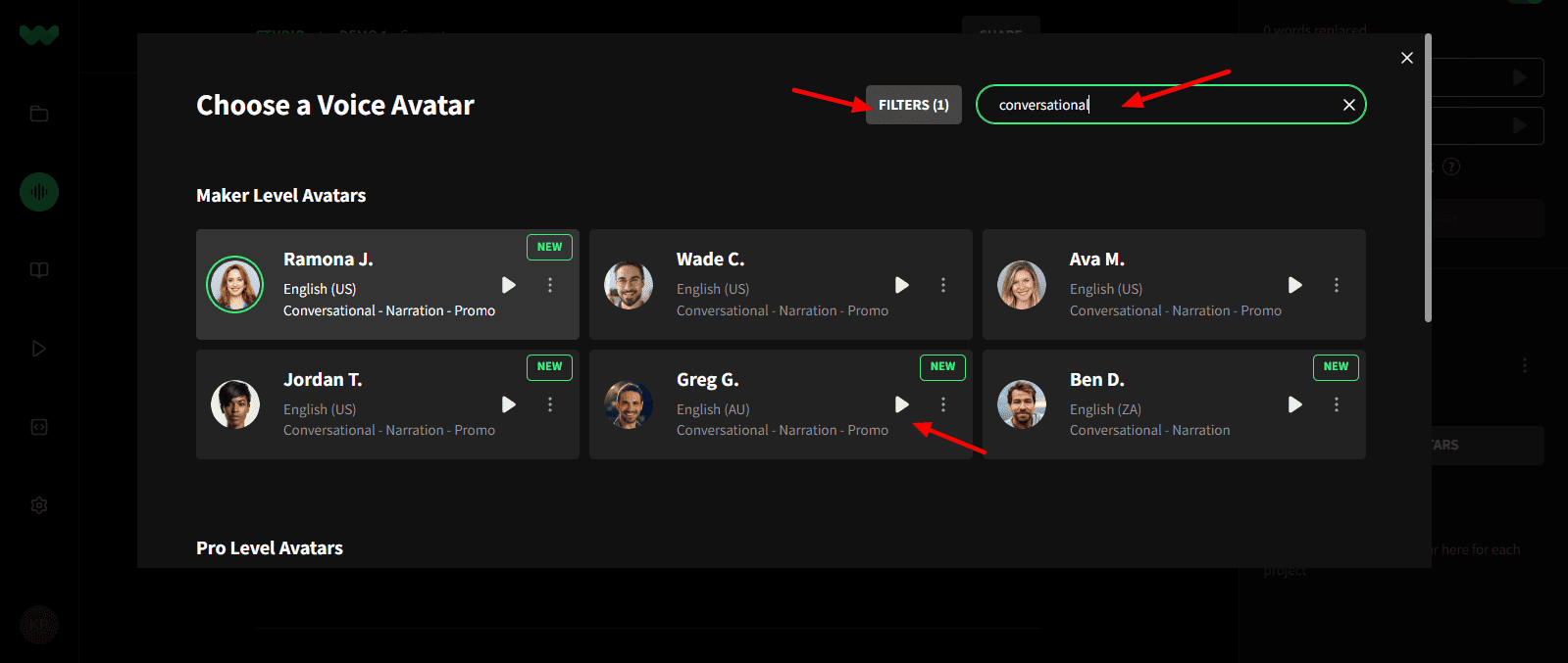 To get started, you can browse through their library and choose a voice avatar. It also lets you filter them by regional accents, voice characteristics, and performance styles. Then you can paste your script and let the AI narrate it to you in your selected voice style.