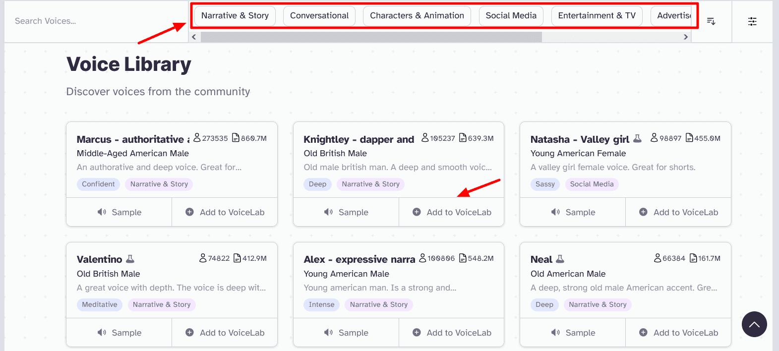 If you want more languages and voice textures, you can use the ‘Add voice’ button to browse their Community voices. The extensive library of voices can be filtered by category, gender, age, accent, or use cases. (social media, narrative & story, conversational, advertisement, etc)