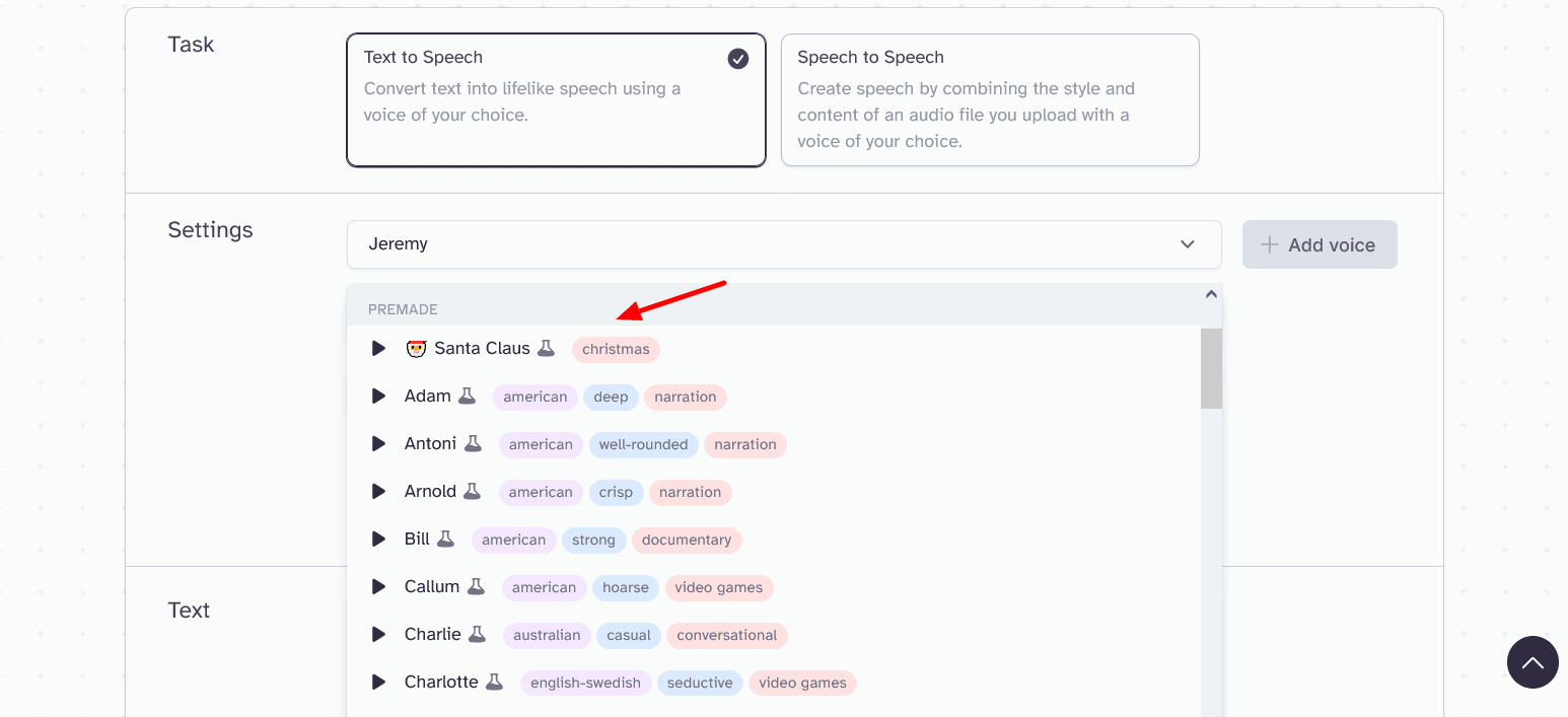 To get started, you can paste your text content in the ‘Text-to-Speech’ section. Then, you can choose from their pre-made voices that feature refined voices in various English accents. Besides every voice, you’ll find a description of the voice quality and best use case.
