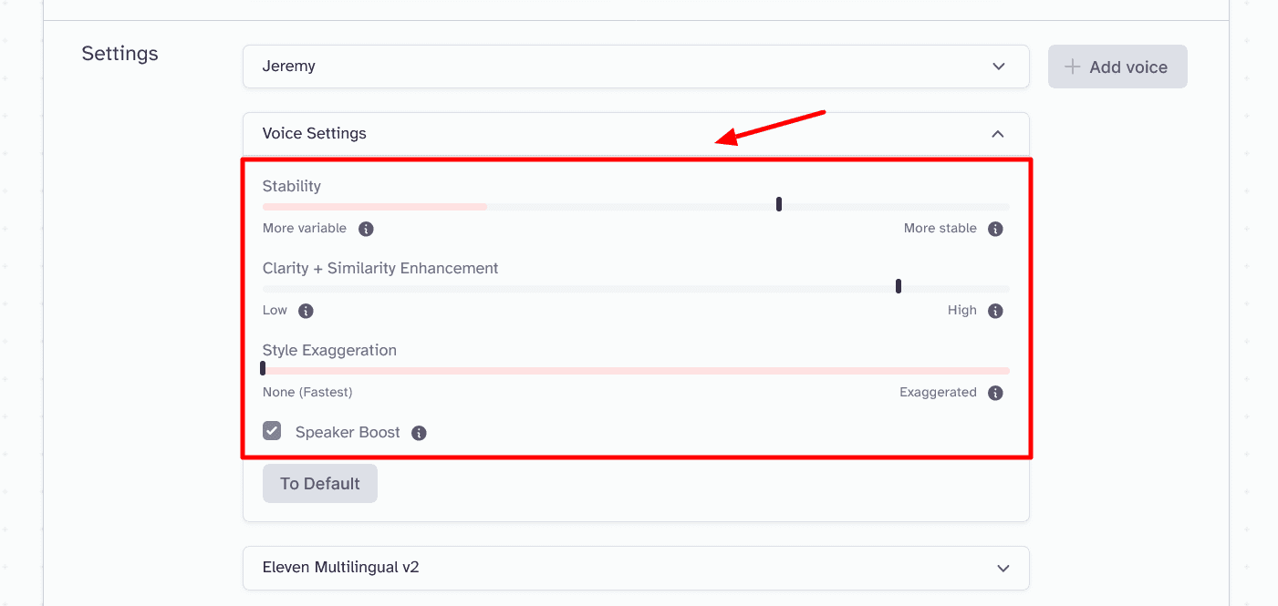 Once you find the perfect voice to narrate your content, you can adjust the voice stability and clarity+similarity enhancement on a slider bar. If you opt for the Multilingual V2 model, you can also adjust the style exaggeration and speaker boost options.