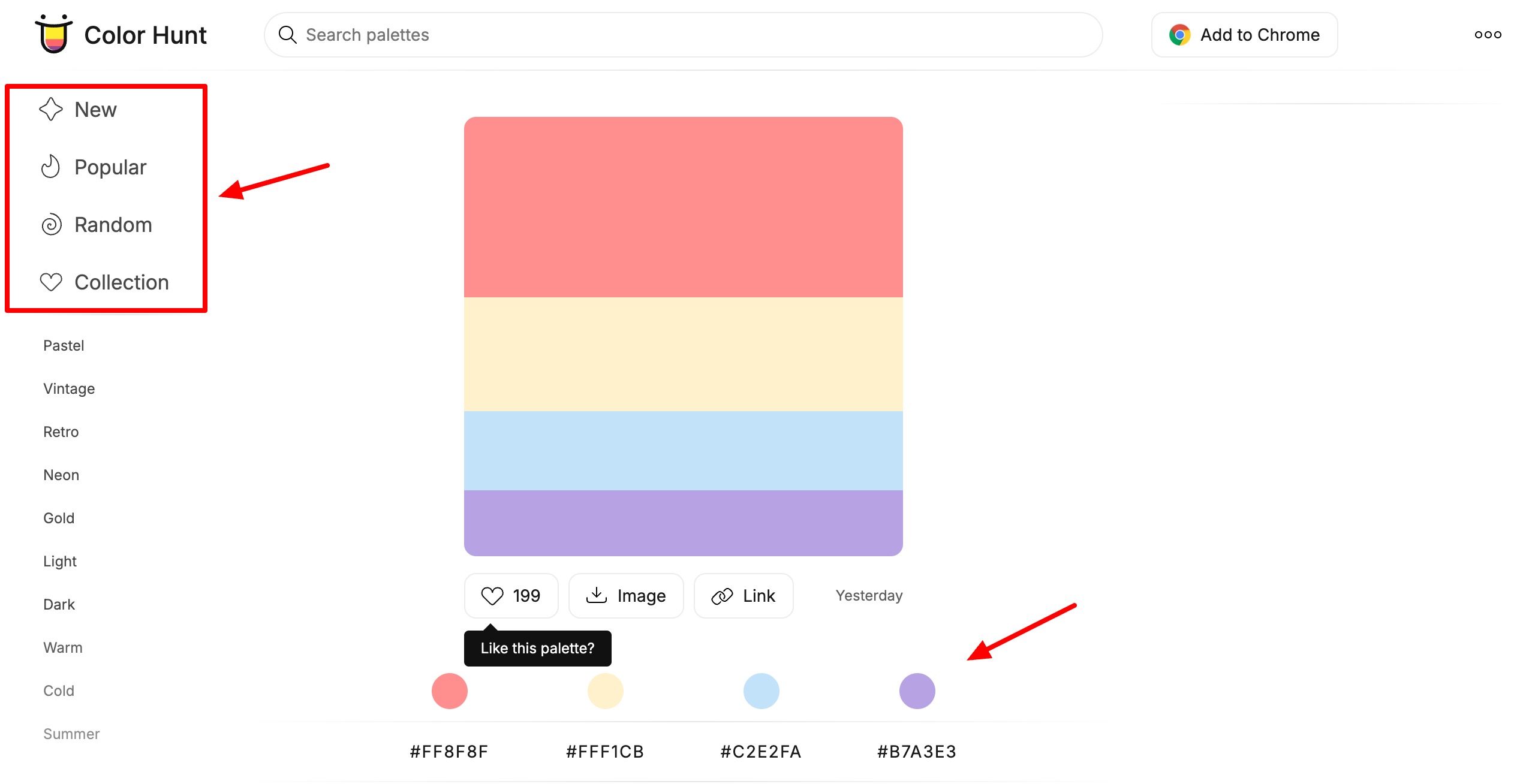 ColorHunt is a free collection of beautiful color palettes curated by their team. Each palette on the platform features 4 colors that you can search by theme, like Pastel, Neon, Wedding, or Kids. You can also browse through sections like New, Popular, and Random.