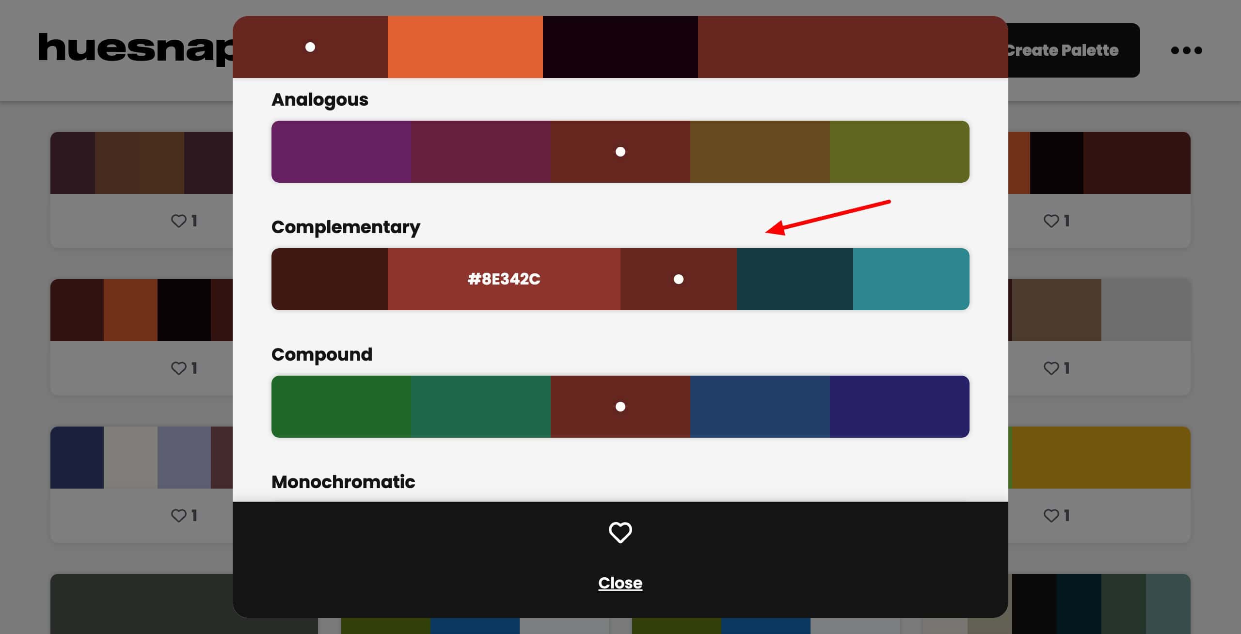 Huesnap offers multiple color schemes, 5 types of color codes (HEX, RGB, HSV, HSL, CMYK), and hundreds of curated palettes. Additionally, you also get mobile apps for Android and iOS. The only limitation of Huesnap is that palettes can’t be exported.