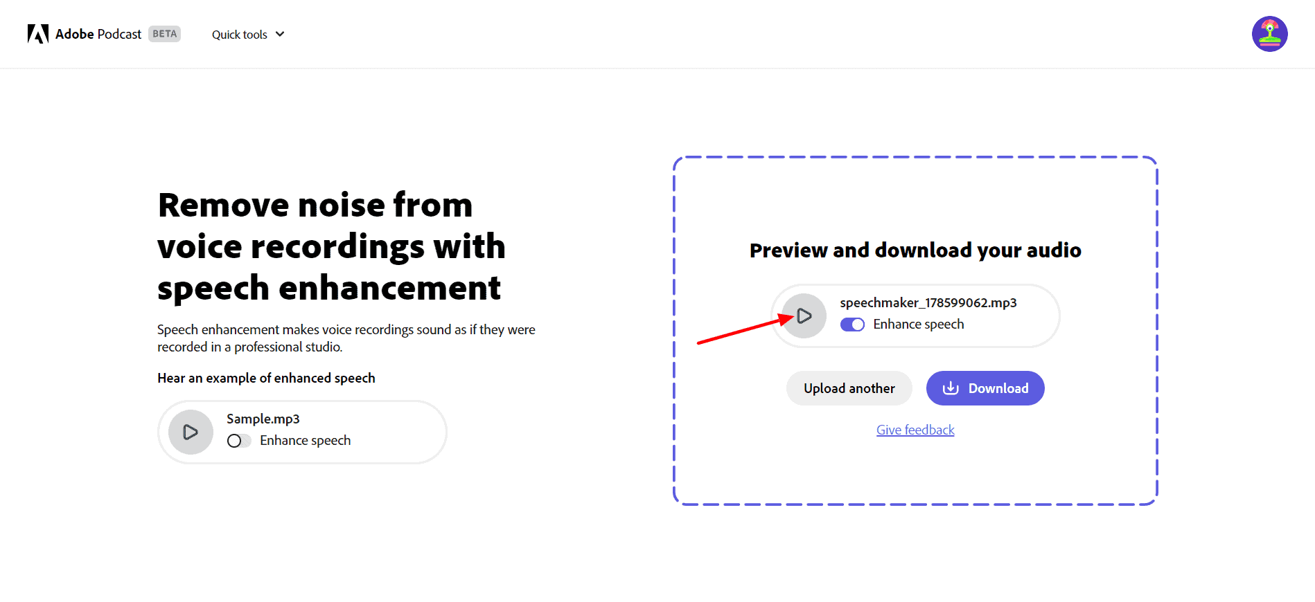 Alternatively, if you wish to remove background noise from your audio files, you can head over to the Enhance Speech Tool and upload your audio file. It’ll strip off all the noise from your audio and make it sound professional and clean.