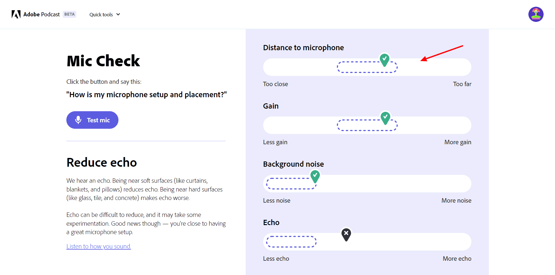 Next, if you wish to check the quality of your mic, head over to the Mic Check tool. Allow it permission to access your mic and speak the test sentence displayed on the screen. It’ll analyze your distance to the mic, gain, background noise, and echo, and rate your mic quality.