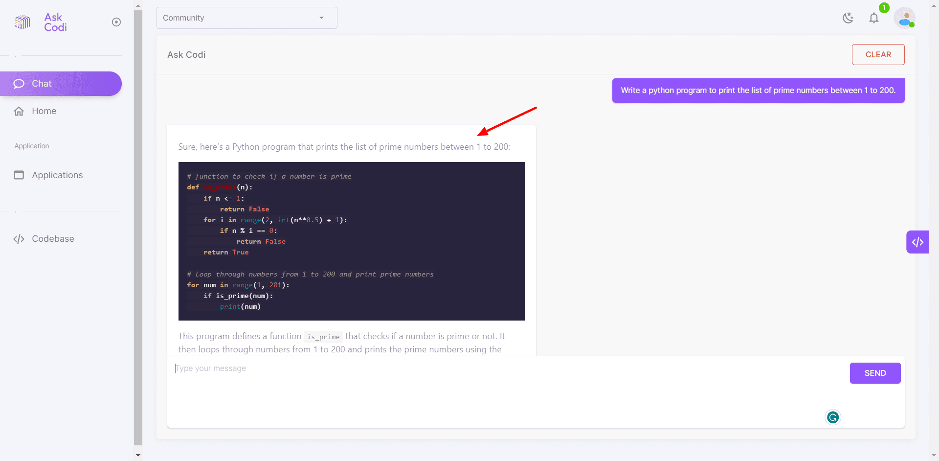 Under the Chat section, you can type in any coding query in a conversational language and it will generate the code for you in an attractive and color-coded template. It will also provide a short and helpful description of the program.