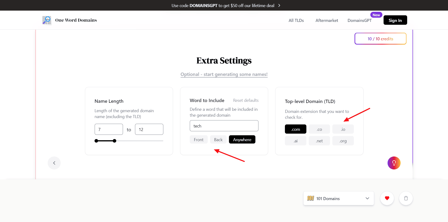 Then, you can specify a name length along with words, word positions, and popular domain extensions you wish to include.