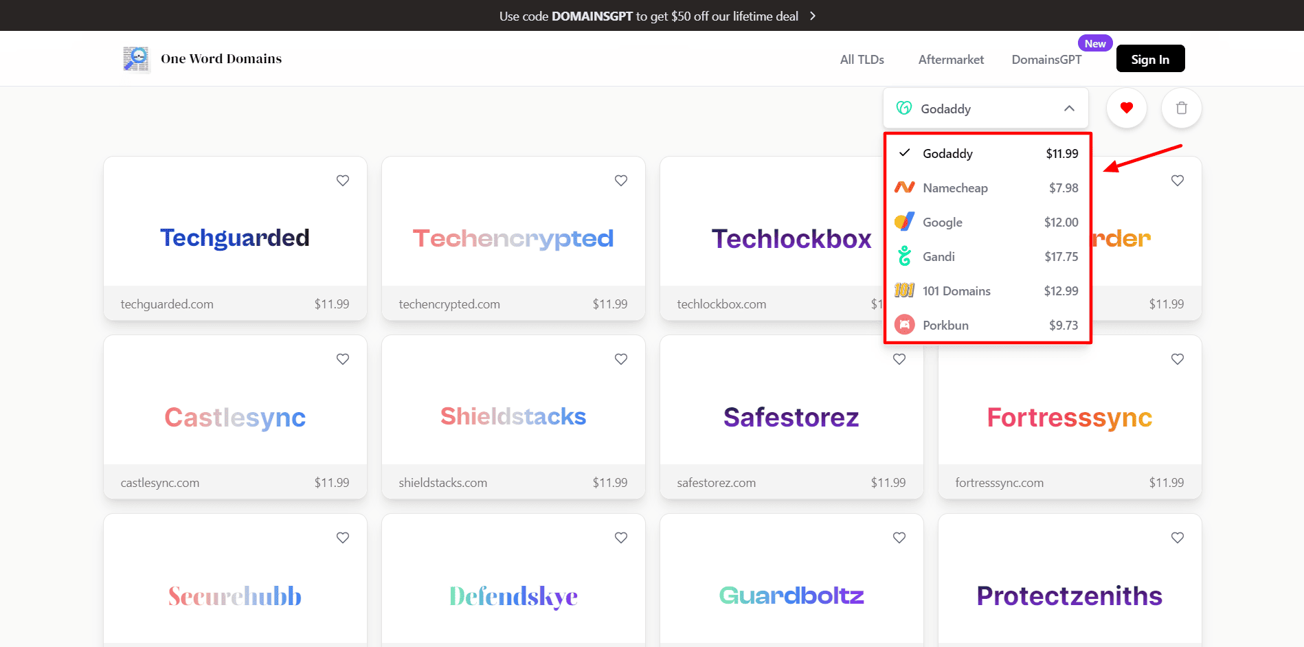 You can view prices for the domain name of your choice on 6 domain name registrars, including GoDaddy, Namecheap, Google, Gandi, 101 Domains, and Porkbun.
