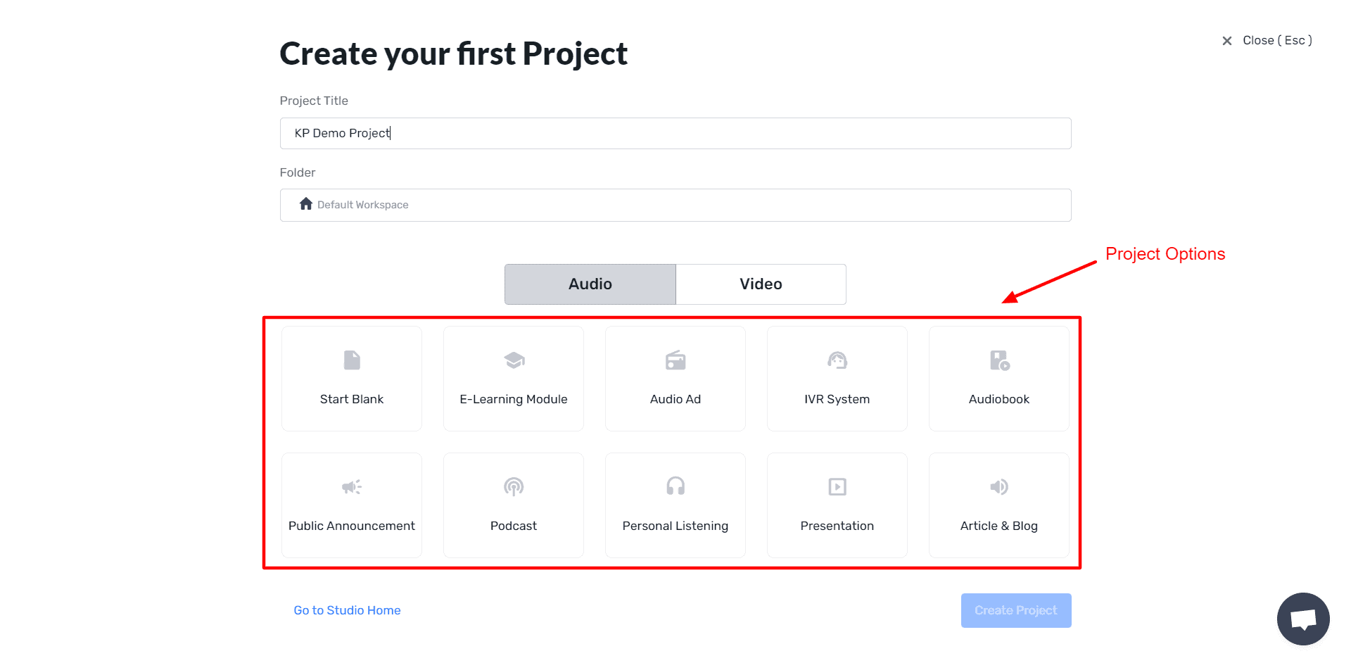 For instance, under Audio Projects, you can create audiobooks, podcasts, e-learning modules, presentations, articles, blogs, etc. Whereas, under Video Projects, it lets you create training videos, explainer videos, video games, video ads, etc.