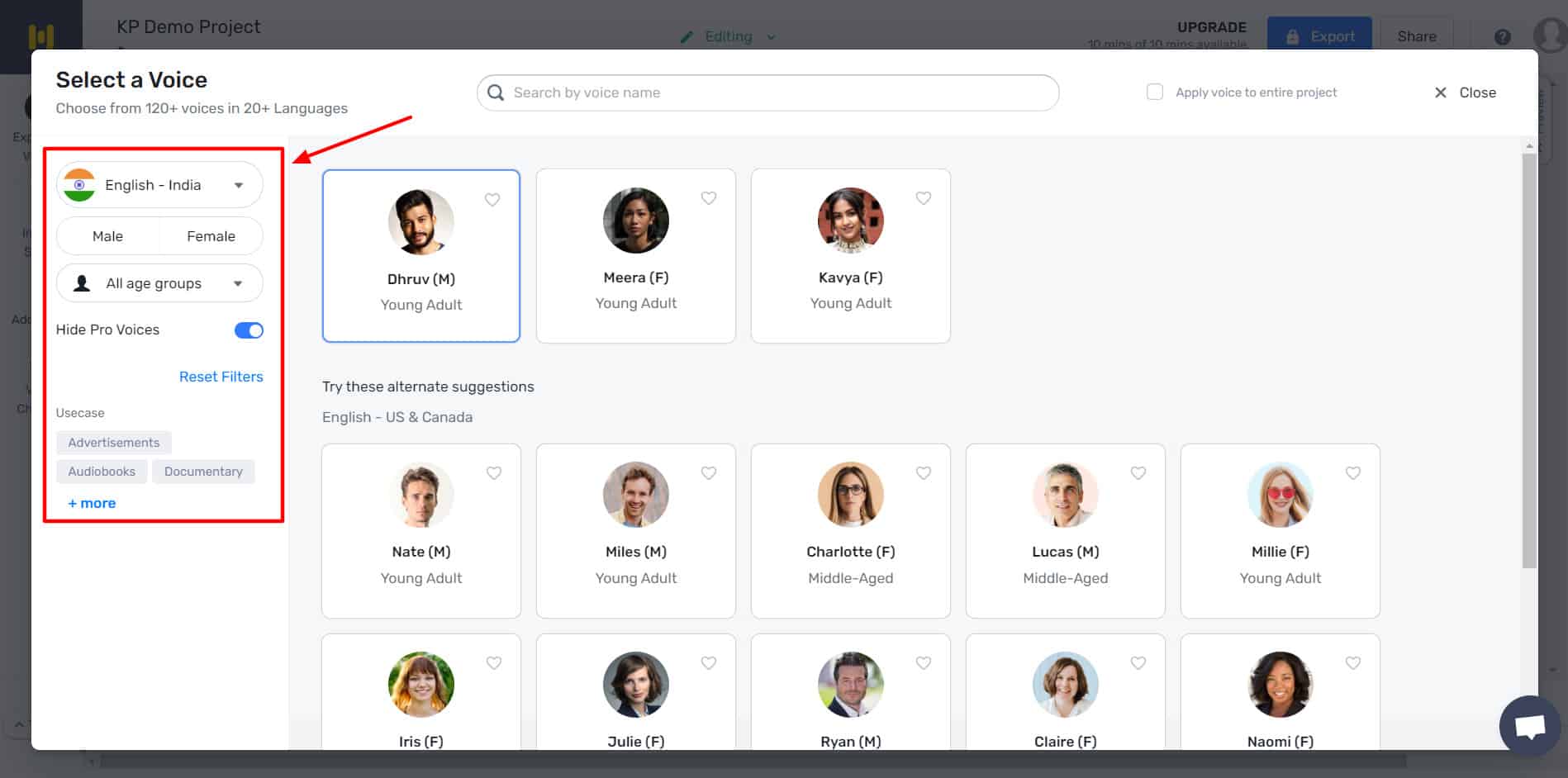 I liked using the Voice Changer feature in Murf AI. All you need to do is upload your audio or video file on Murf and select a language. It’ll convert your file into a text script. Then you can select any AI voice to narrate the script for you!