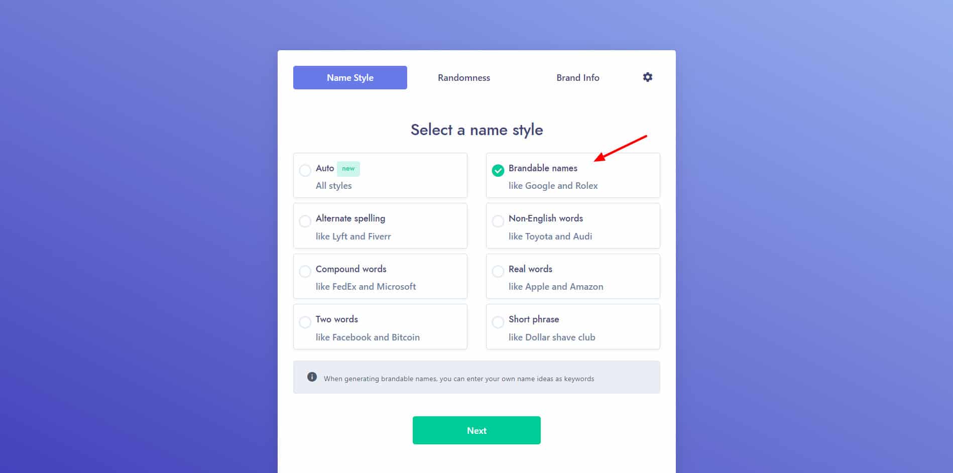 To get started, you need to visit the Namelix website. Next, provide it with a few keywords around your domain and select a style and randomness. Finally, you need to supply some information about your brand.