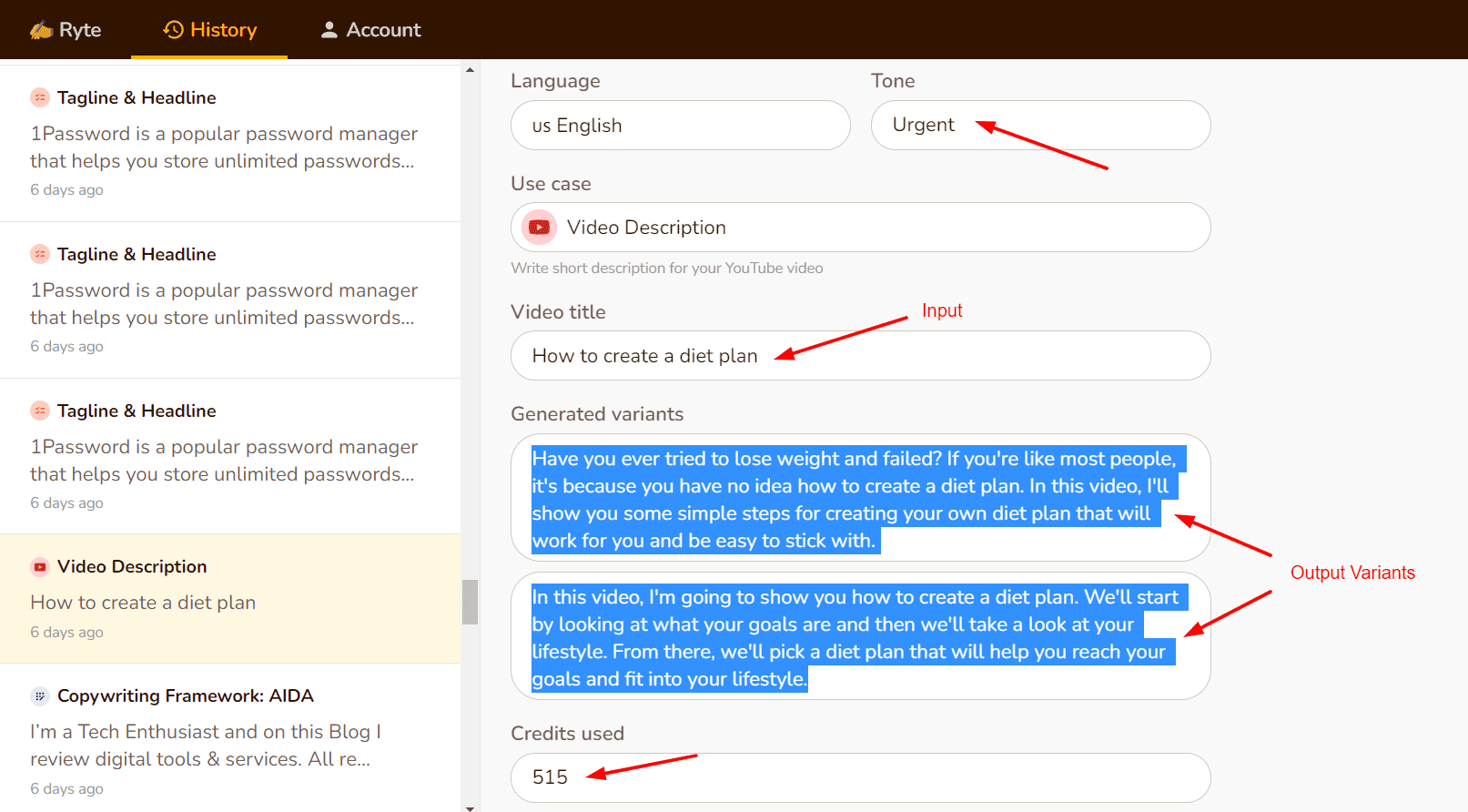 For instance, the following are the results when I asked Rytr to generate a Video Description on the topic “How to create a diet plan”.