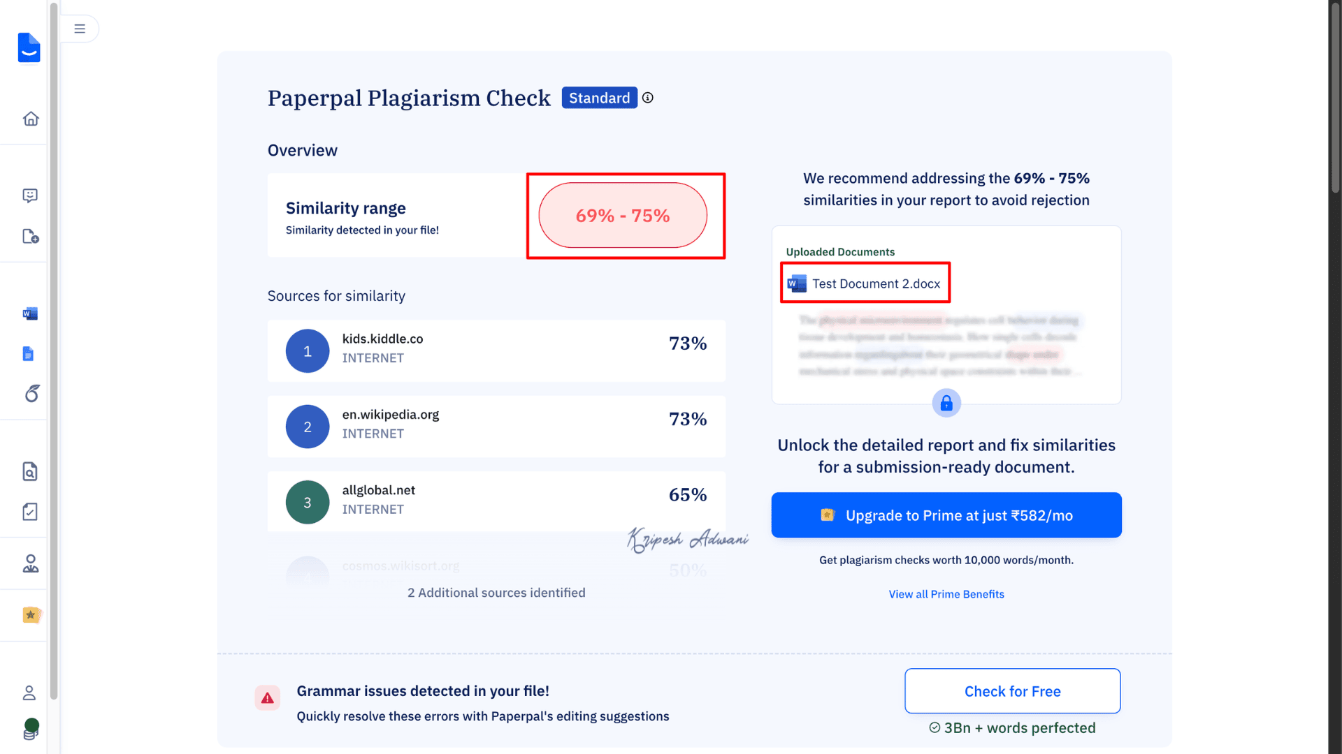 PaperPal’s free plan allows users to check up to 7,000 words per month (approximately 25 pages). To scan up to 10,000 words/month and unlock detailed reports with full source details, you can upgrade to the Prime Plan at ₹582/month.