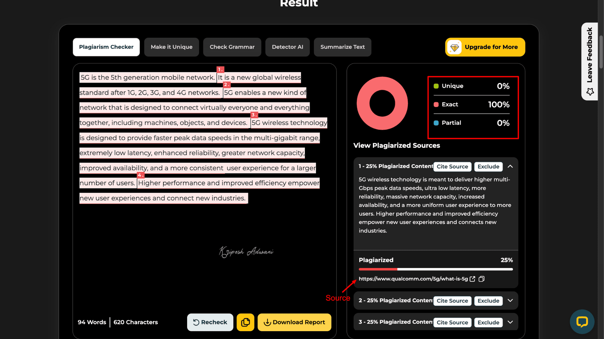 SmallSEOTools scans billions of web pages using its database software. I’ve personally used it for years to get detailed reports on both exact and partial content matches. Unlike Copyleaks, it provides all matched source URLs along with sentence-by-sentence results.