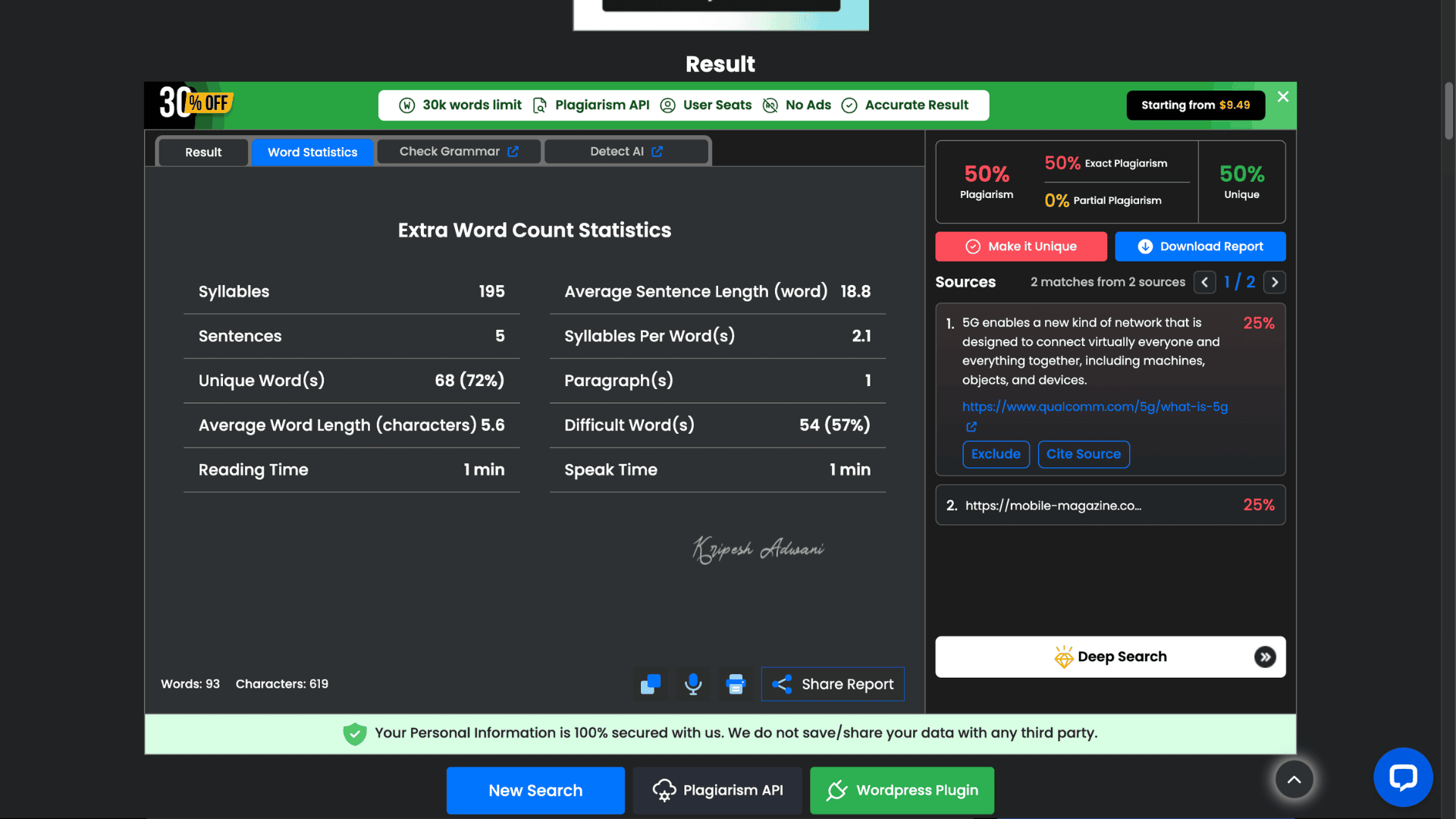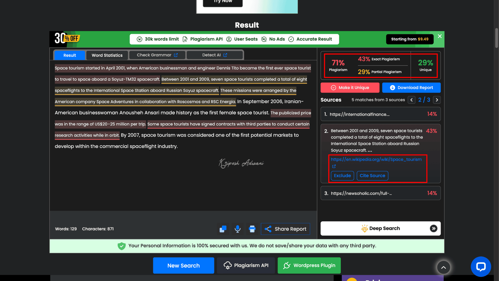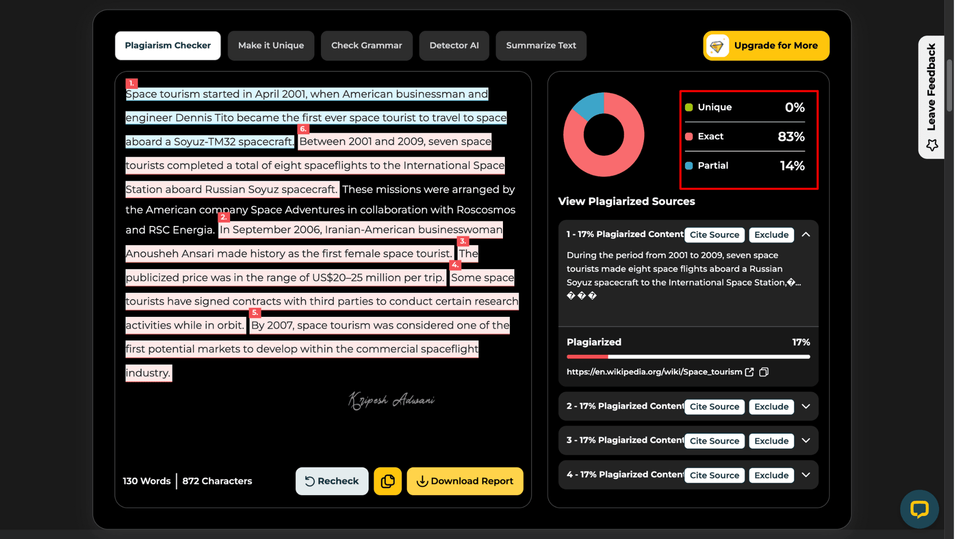 However, the tool limits the number of document scans, which may not be sufficient for professional or frequent use. Also, if a piece of plagiarized content matches multiple sources, the tool will only show one source and omit the others.