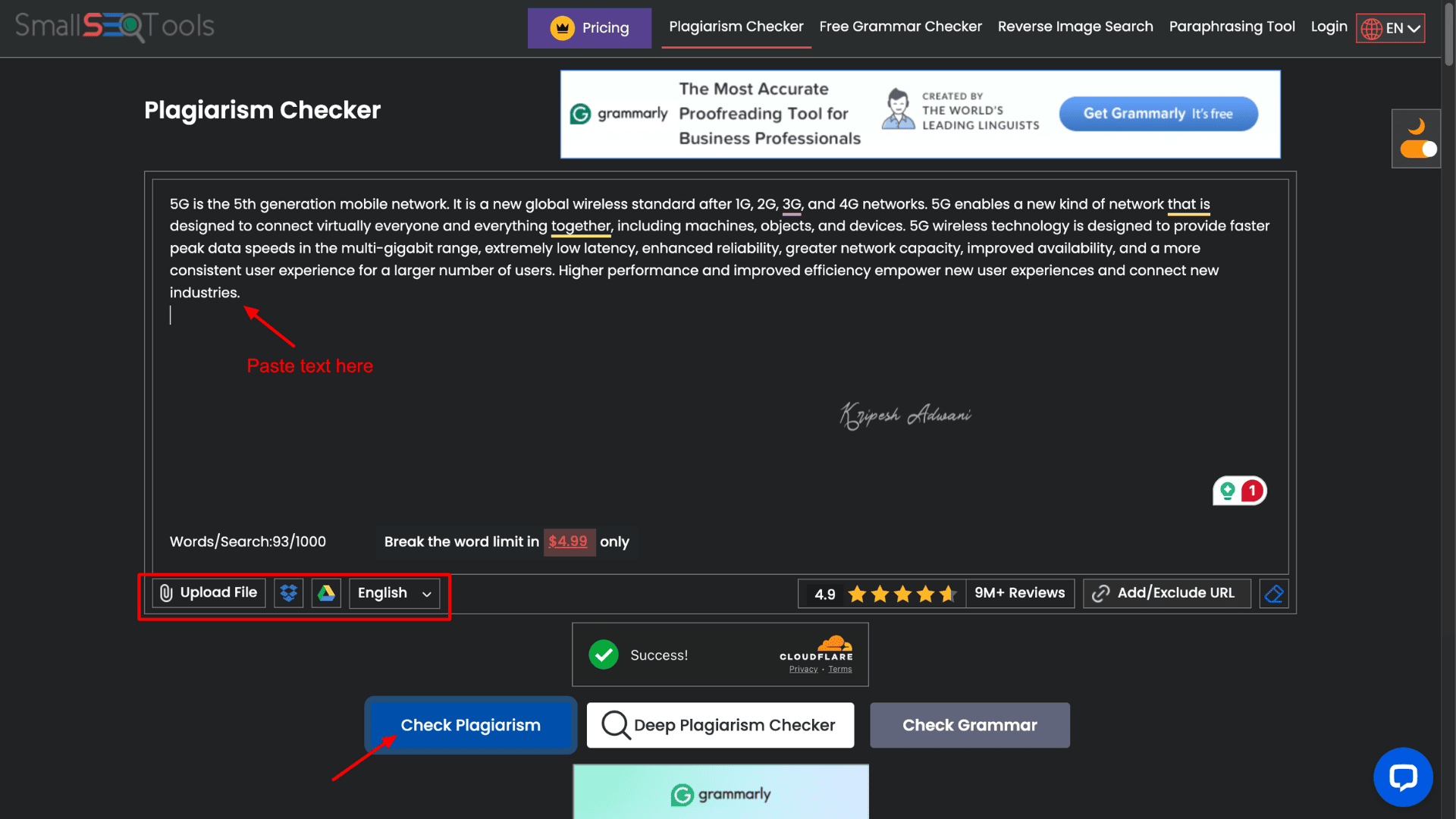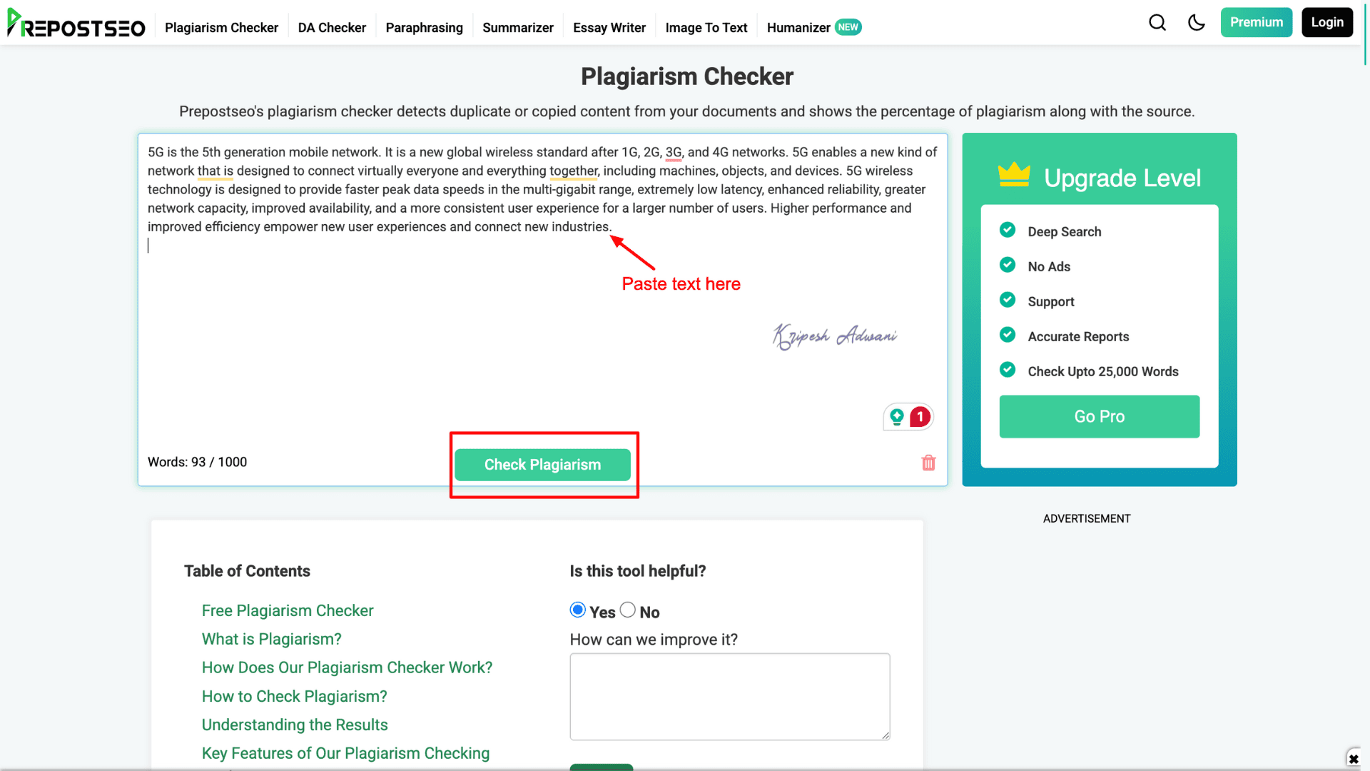 To use the tool, you must sign up and create an account on their website. Once logged in, you can upload your file. The tool will automatically scan and generate a plagiarism report.