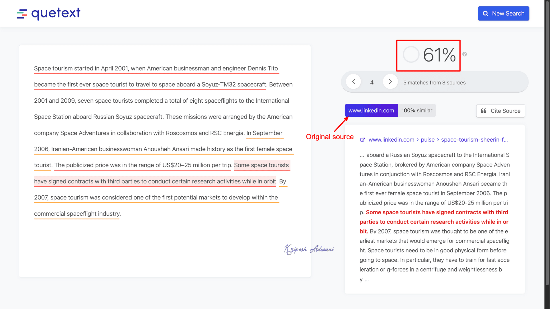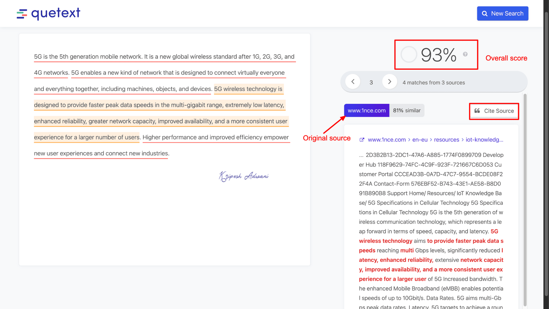 By clicking the dropdown menu under each source, you can view the exact text that was flagged, also highlighted in red. Plus, Quetext allows you to cite sources and view the individual similarity index for each match.