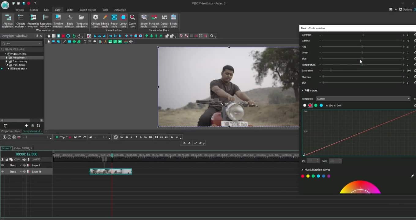 You can perform an advanced level of color correction and color grading in VSDC. It lets you adjust the basic settings like contrast, brightness, saturation, etc. You can also edit the RGB curve, Gamma ray, Hue-saturation Curve, etc.