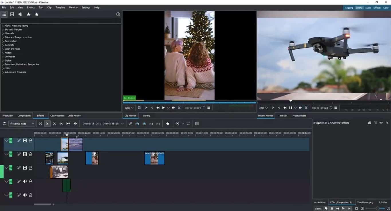 Kdenlive lets you add multiple layers to your videos and edit them together. You can add music, video clips, text, objects, image overlays, and other effects on top of each other to create professional looking videos quickly!