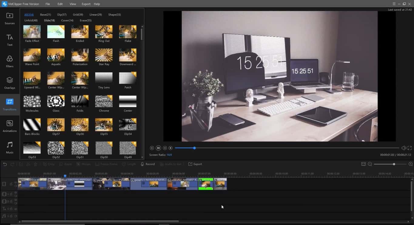 You can find loads of pre-designed and ready-to-use transitions you can simply drag and drop between different clips to implement a smooth flowing video clip!