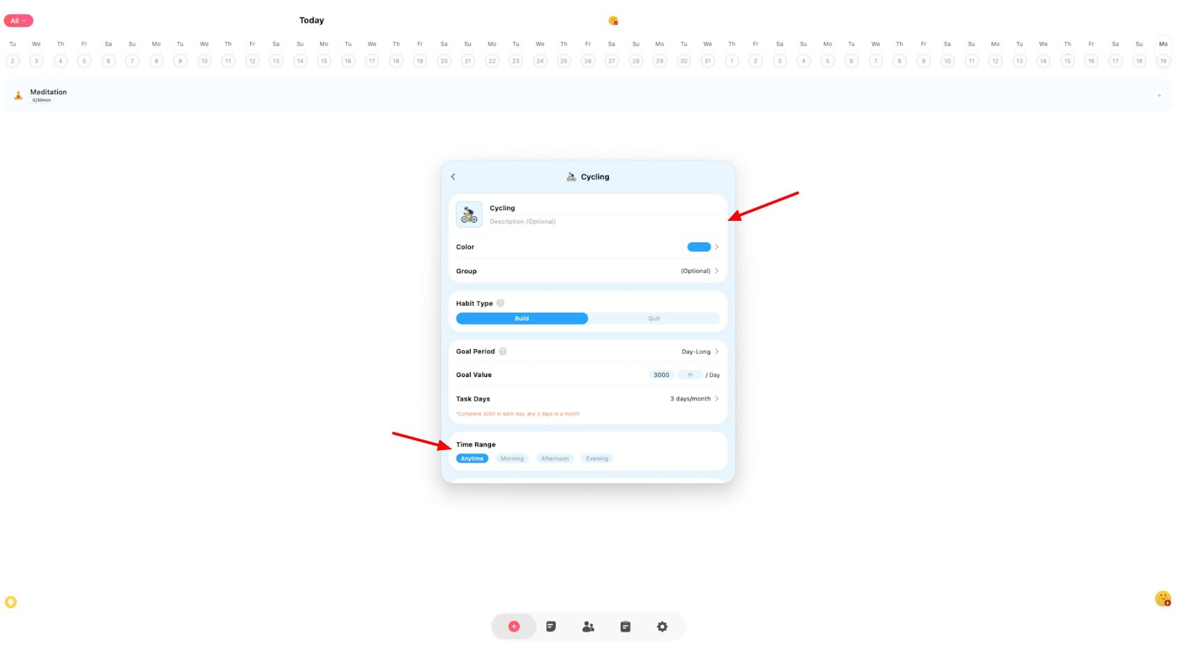 While creating any habit, you can set the privacy to public or private. If you keep it public, the community can see your check-ins. You can also set a weekly target for how many days in a week you wish to perform the habit (or check-in), and set a reminder on specific days & timings.