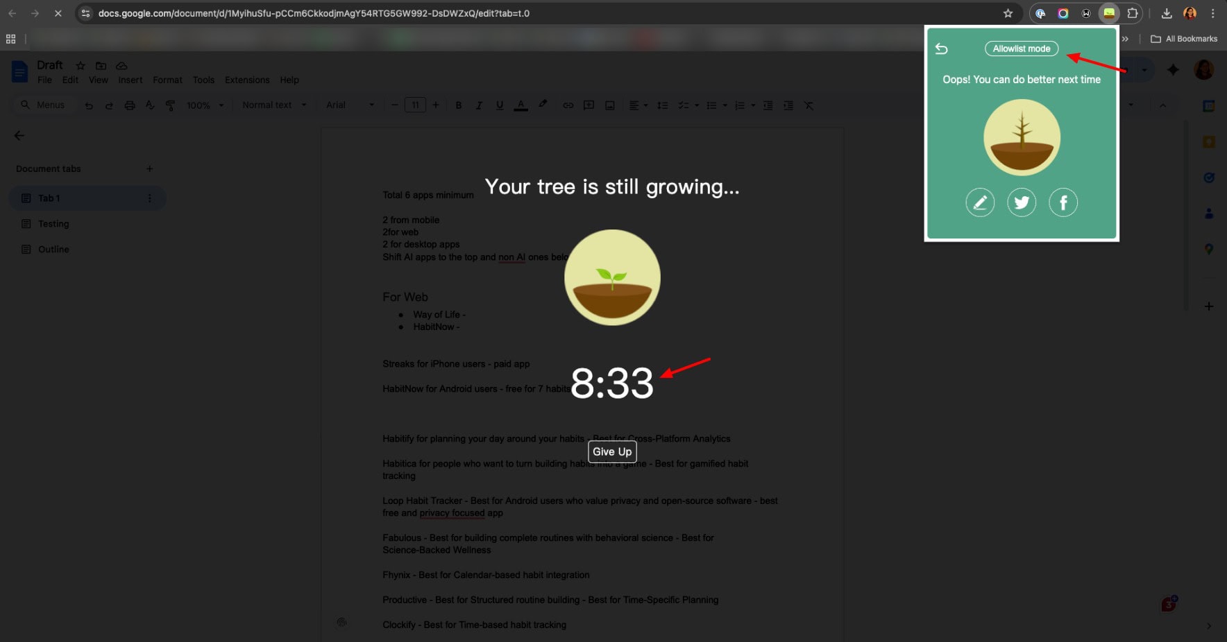 To start with Forest, you just need to begin a new session and get to work. It features a 10-minute timer, and as you keep working, your tree keeps growing. You can also blocklist or allowlist different websites while using Forest.