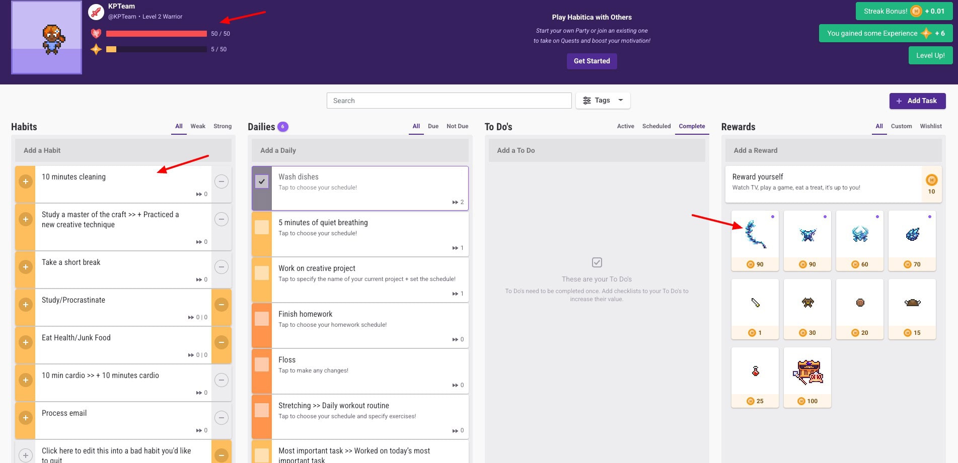 As you keep on completing your tasks, you level up in the game. It also helps you gain XP and gold, using which you can purchase items in the game, like gear, pets, and real-life rewards! But on failing to perform your tasks, you lose health points (HP).