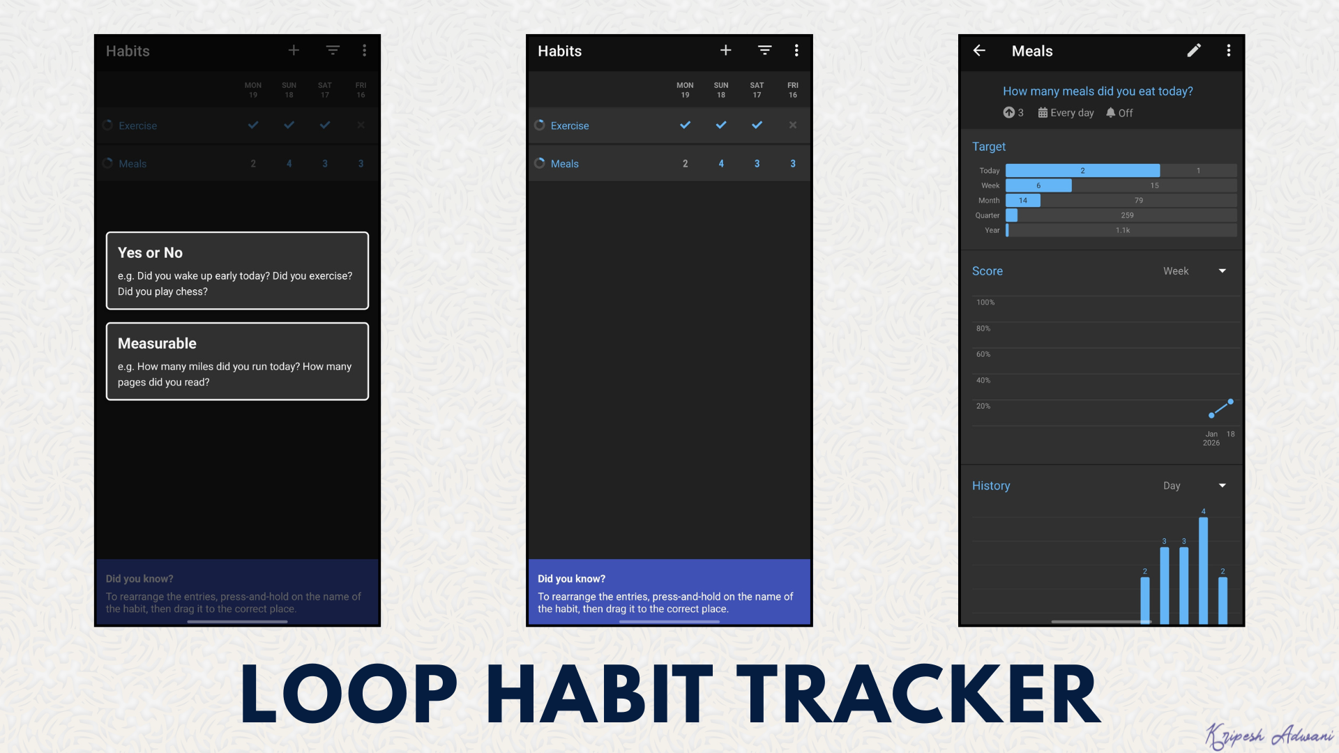 Loop Habit Tracker is a completely free and open-source habit-building app with over 50 lakh downloads on the Google PlayStore. You can get started with it by creating a habit. Habits are of 2 types: Yes/no habits and measurable habits.