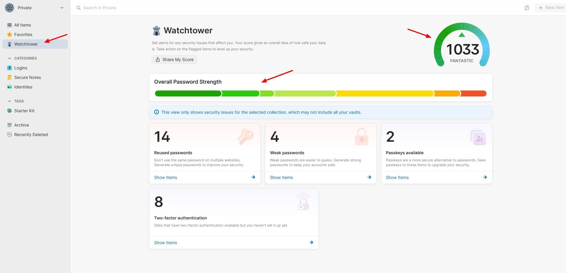 What makes 1Password stand out is its Watchtower feature. It monitors weak passwords and keeps you informed if any of them have been compromised. It also has a Travel Mode, which hides sensitive data from your vault while traveling.