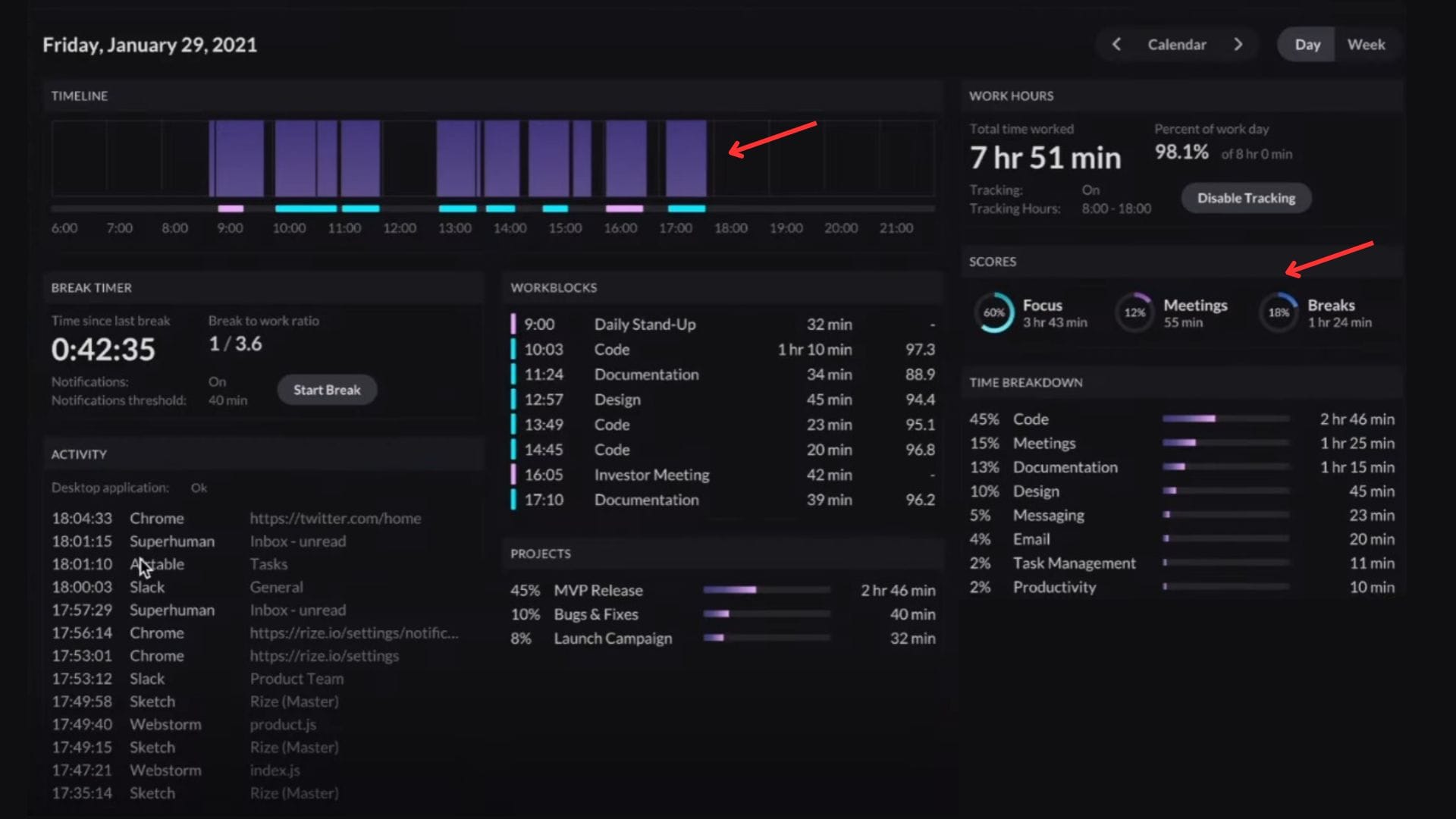 If you’re a music fanatic just like me, you can also enable Focus Music to better concentrate on work. On its dashboard, you can check out your activities along with time, total work hours, your work blocks, projects you worked on, your break timer, and time breakdown by category.