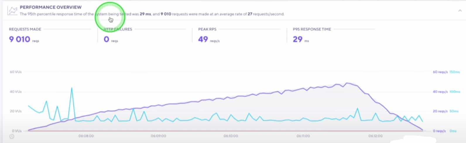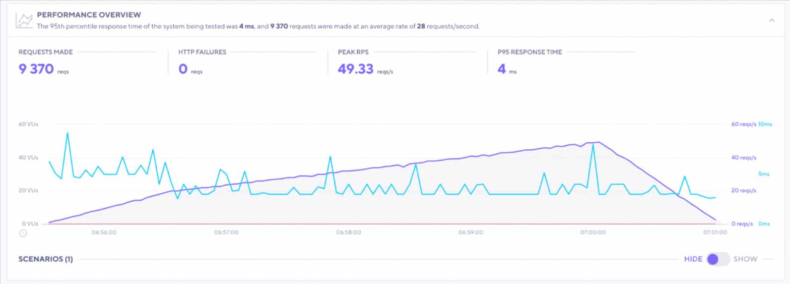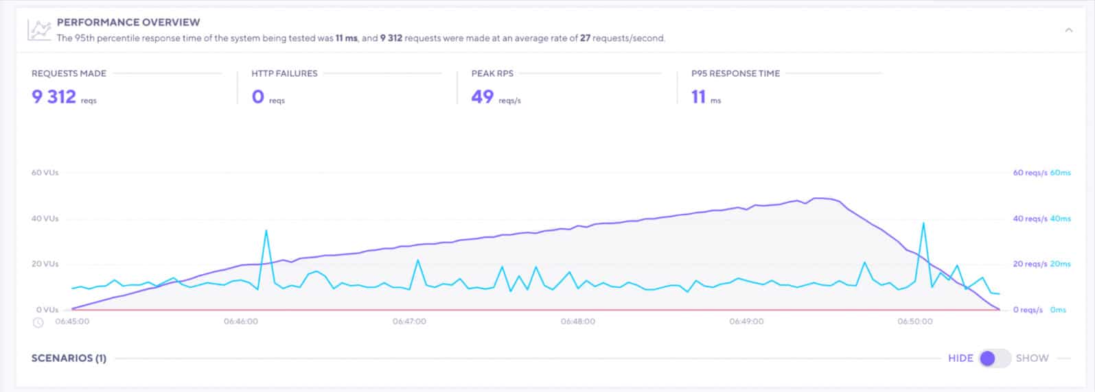 For assessing the load management of InMotion, I sent 50 virtual users over to my website. They made 9337 requests, where the peak requests went up to 49.67 req/sec and the average response time was as low as 10 ms.