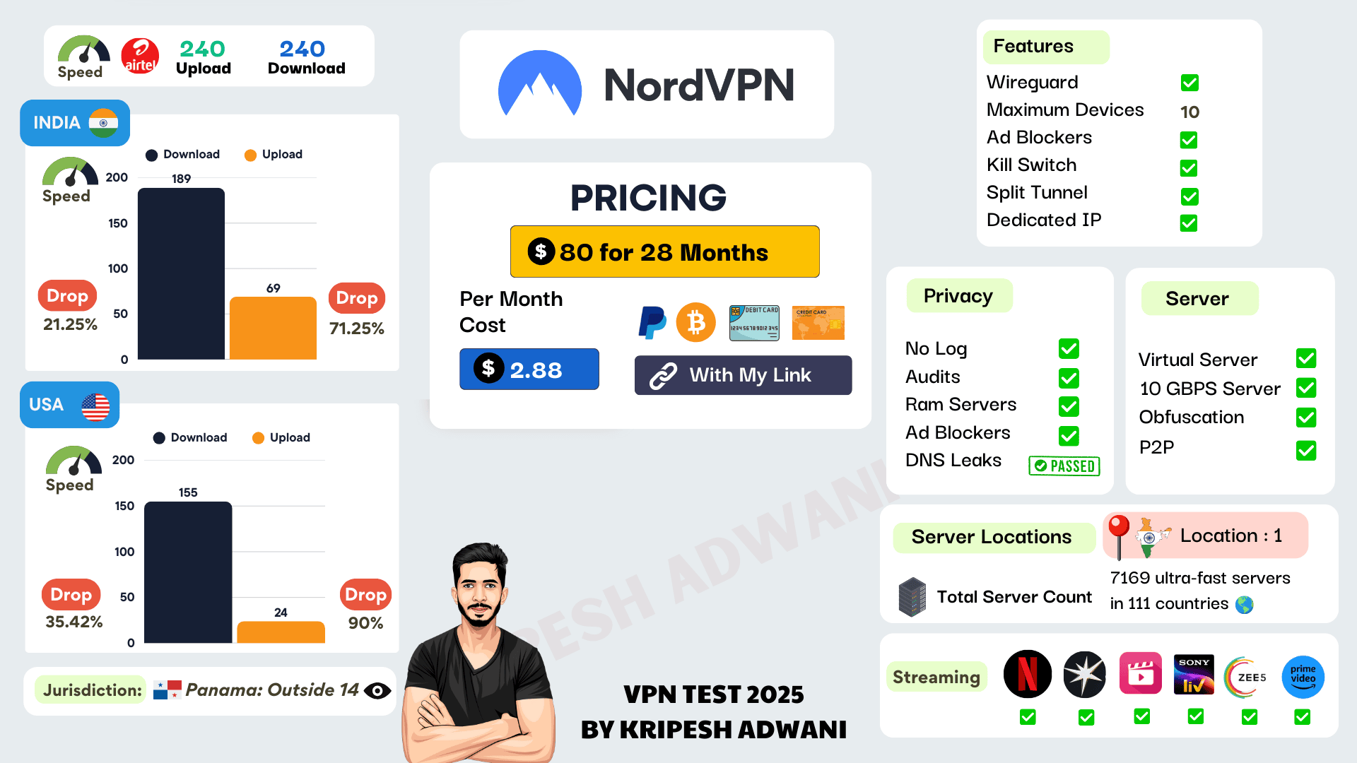 | NordVPN | 7169 in 111 countries | Download: 189 Mbps Upload: 69 Mbps | 66 ms | $2.88/month | NordVPN Review |