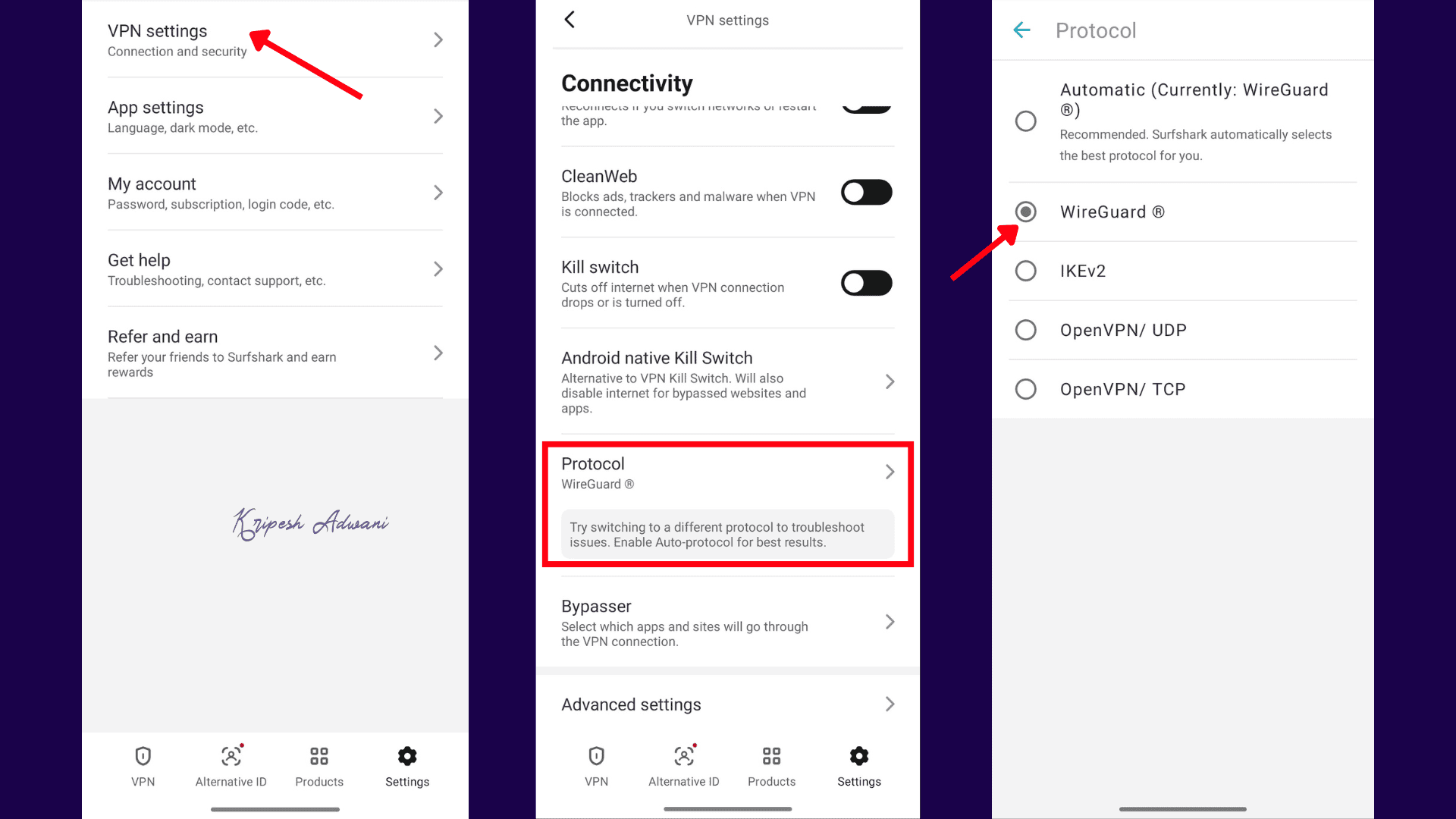 Go to VPN settings from the menu, navigate to “Protocol”, and select WireGuard. Some VPNs may replace WireGuard with their own lightweight protocol—if so, select that instead.
