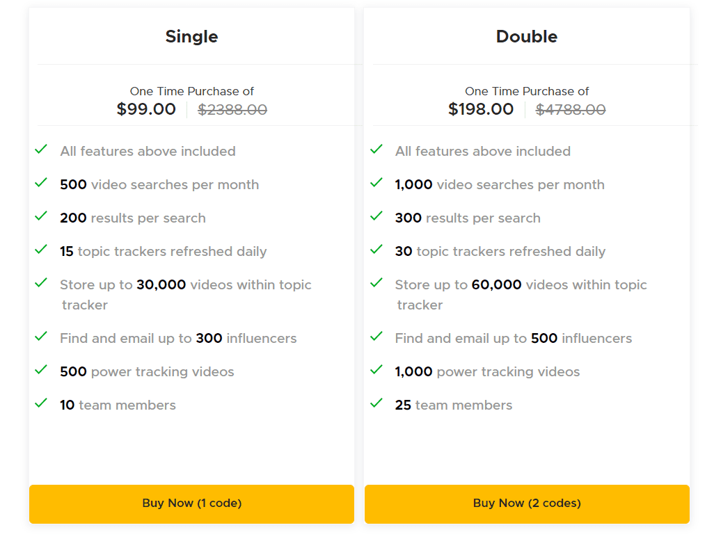 However, what impresses me most is the Biteplay AppSumo Lifetime deal, where you can get this tool for merely $99 for a lifetime. Following are the specifications of the Single and Double plans.