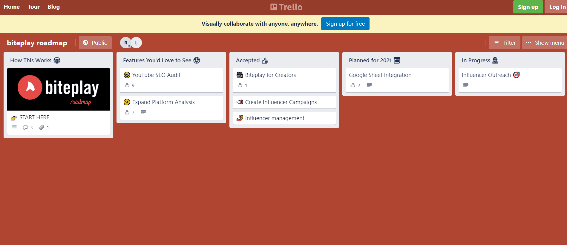 They also have a clearly laid out roadmap of features they wish to implement on their platform. A lot of them are already live on Biteplay. Whereas, some features like Google Sheet integration and Influencer Outreach are in progress.