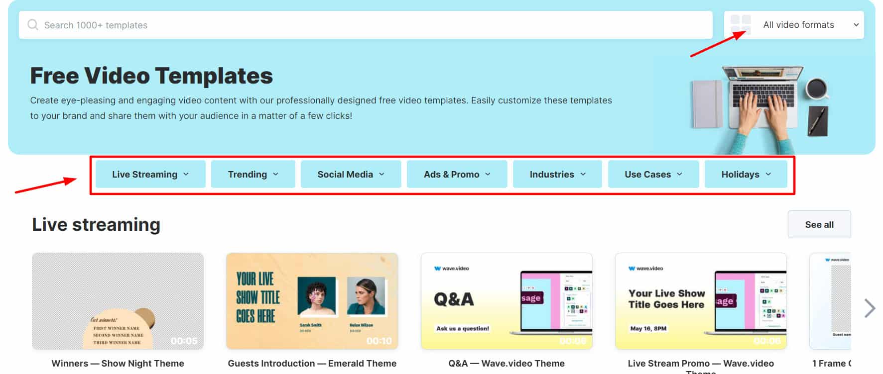 It gives you access to 1000+ free video templates from their collection in various video formats and categories. These include Live Streaming, Trending, Social Media, Ads and Promos, Industries, Use Cases, Holidays, etc. Alternatively, you can also design a professional video from scratch.