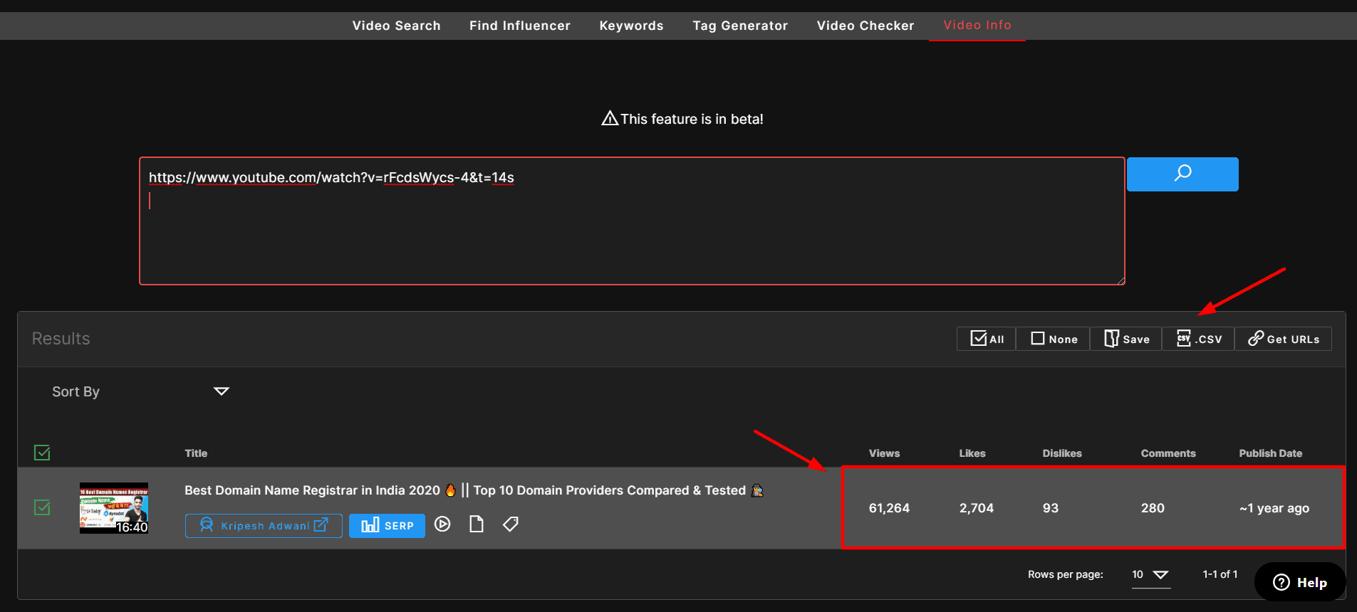 When you enter the URL of a video, it shows you the basic analytics information, like the number of views, likes, comments, publish date, tags, description, etc.