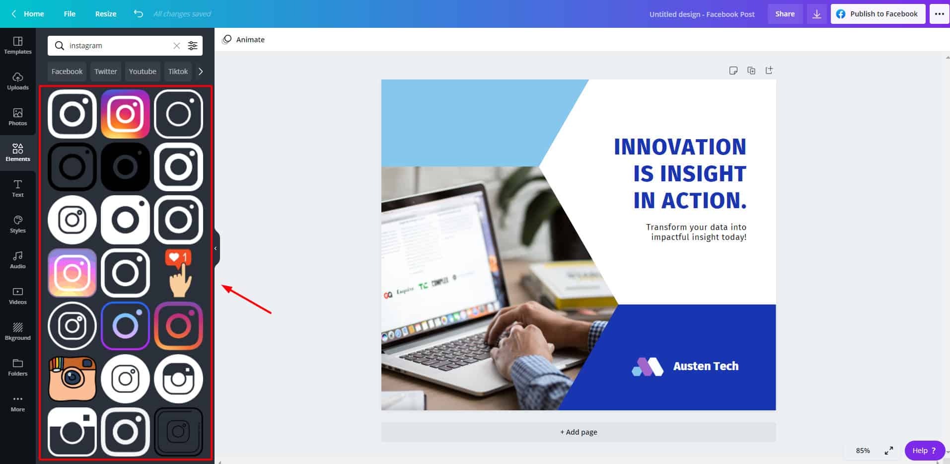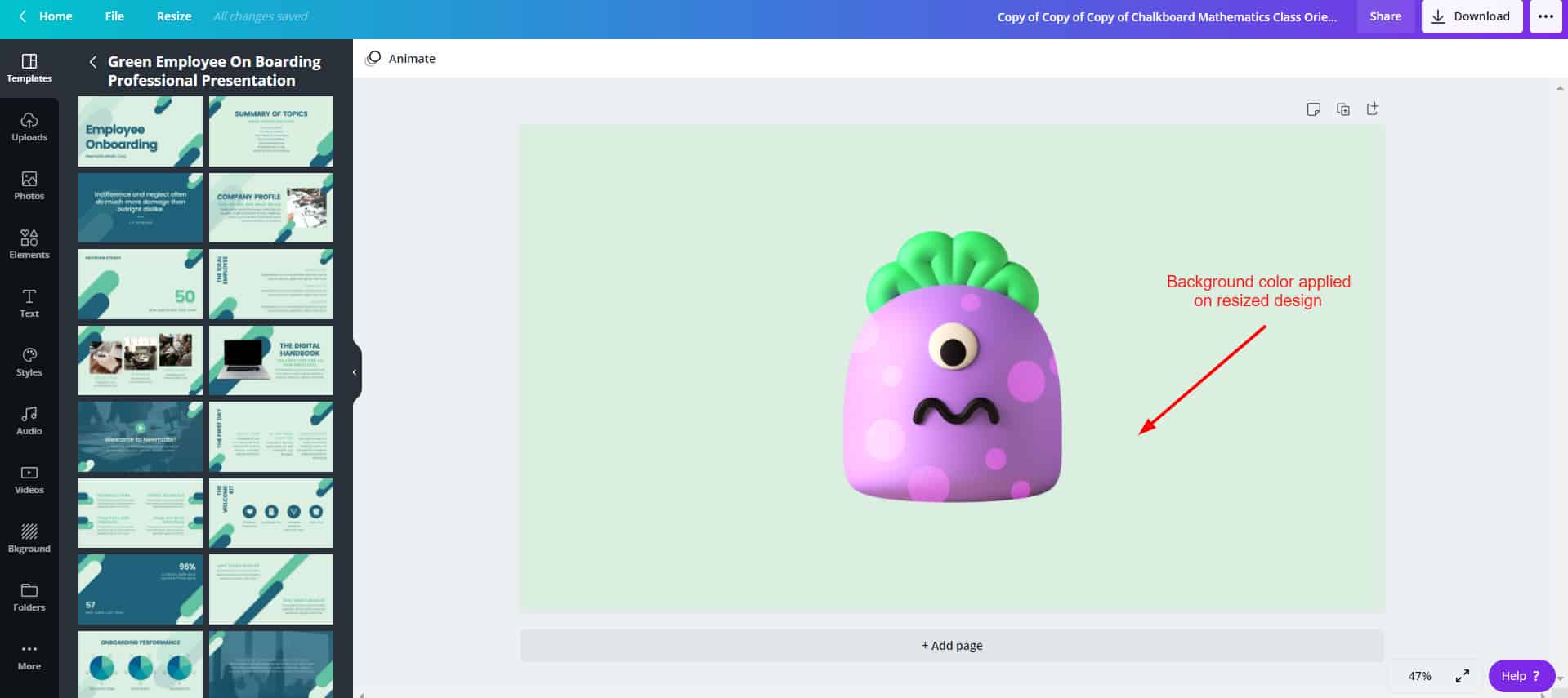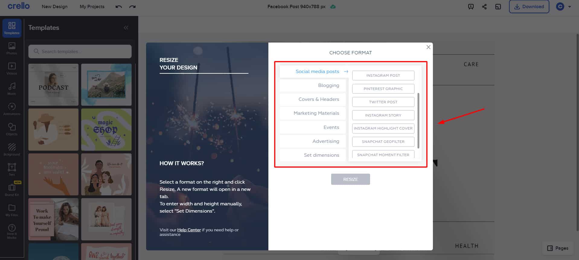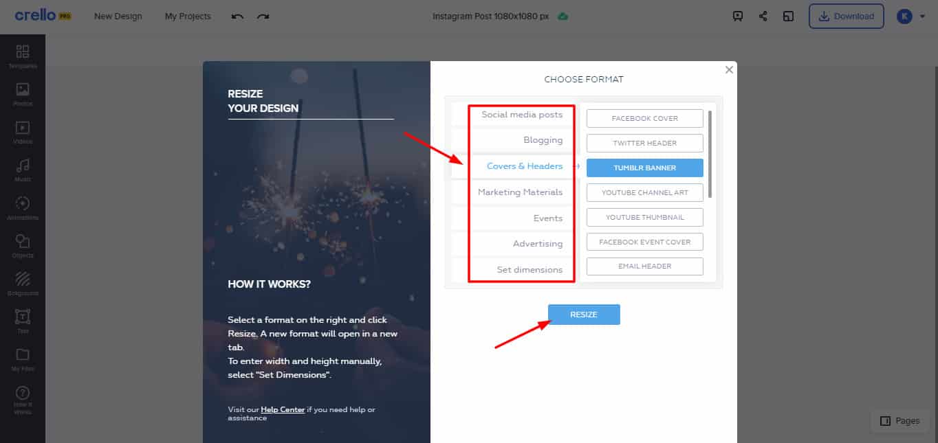 Crello Pro offers a handy resize tool, but it does not resize the elements on the page according to the format selected.