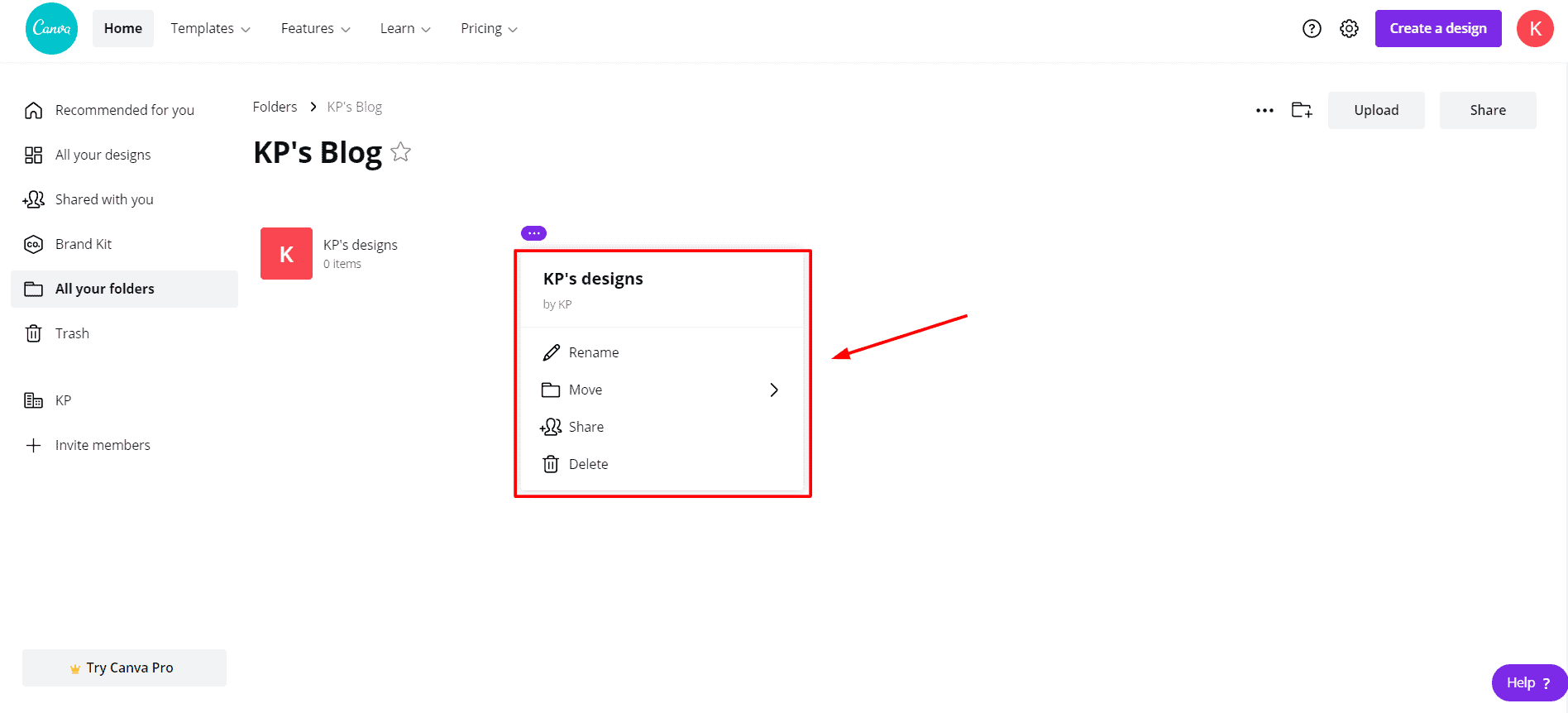 Canva Free lets you rename, share, delete, and present your folders. It also allows creating sub-folders. However, you can only create 2 folders in the free version.
