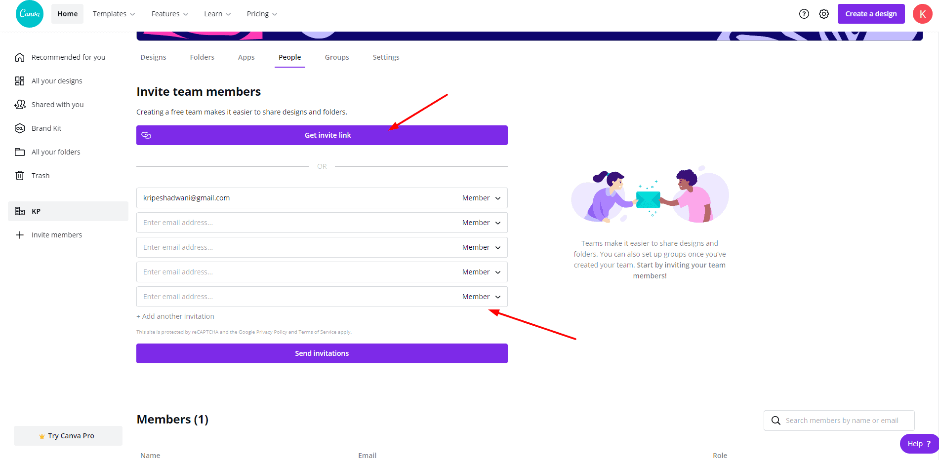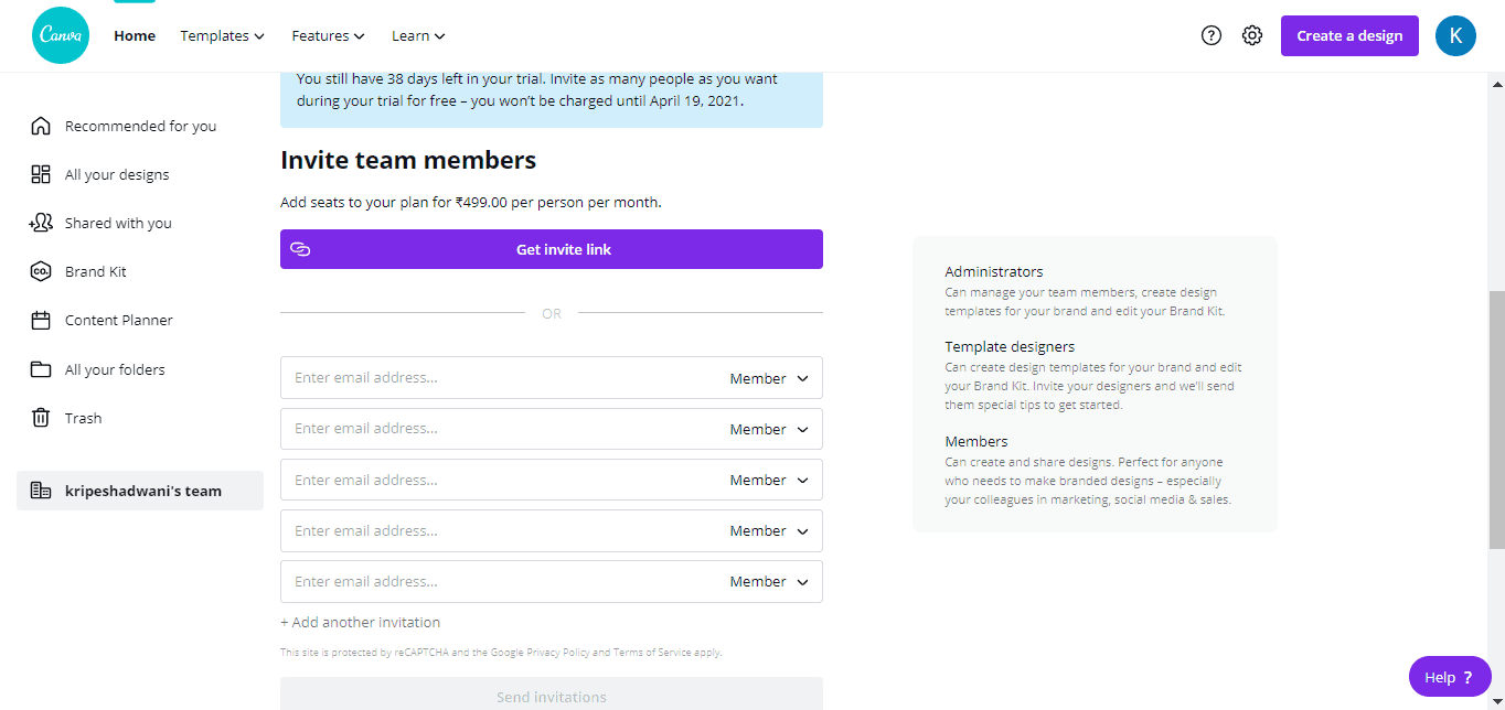 Canva Free lets you create an unbelievable 100 teams with 3000 members in each! For access control, you can assign Admin and Member roles to the added users.
