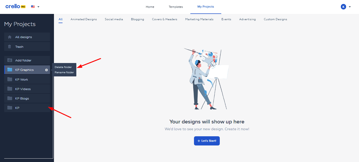 Crello Pro offers basic folder management. So, you can create unlimited folders, but no sub-folders are allowed.