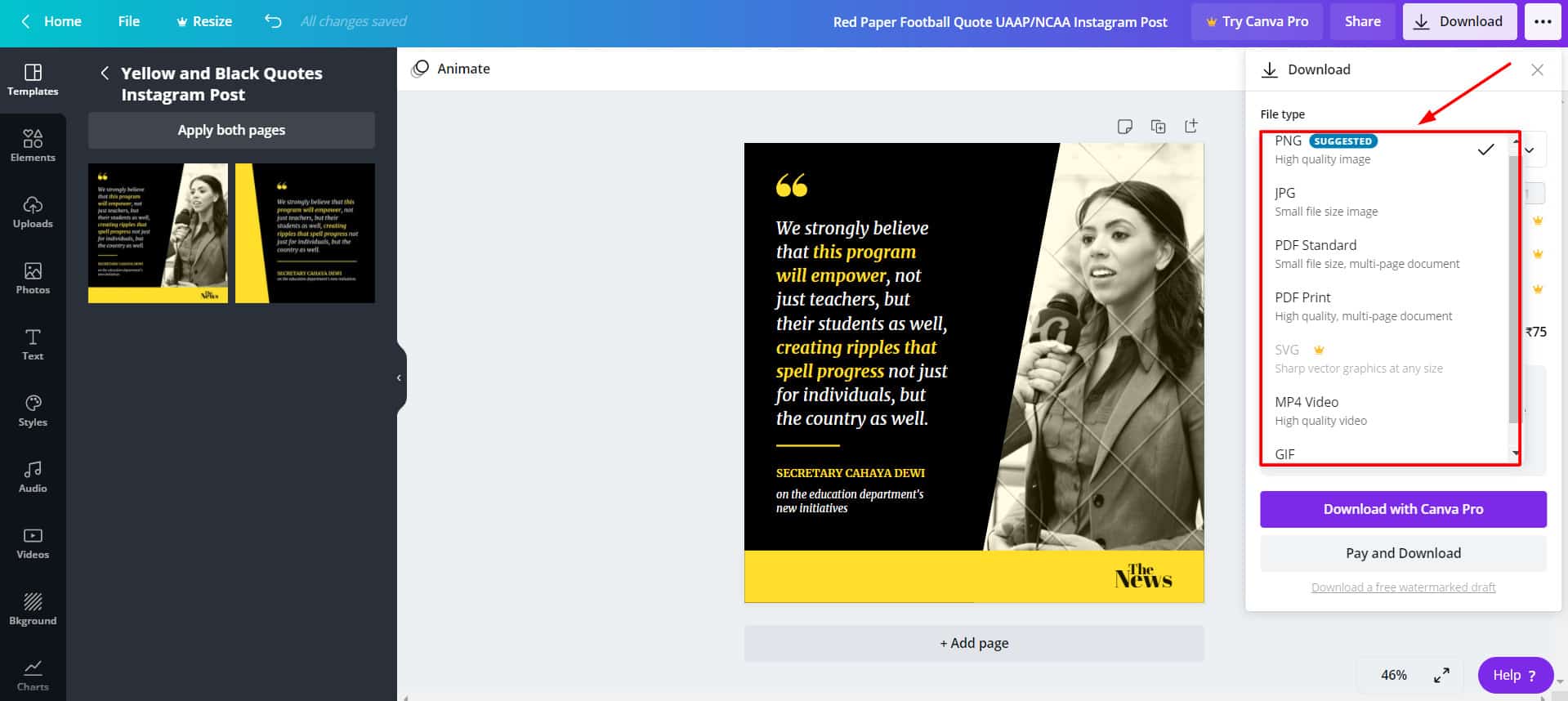 Alternatively, if you want to enjoy some more advanced functions like Brand Kit to create designs as per your brand’s identity, Background Remover, Resize tool, Content Planner and Scheduler, Version History, custom download quality, and thousands of premium elements, then Canva Pro would be the perfect choice!