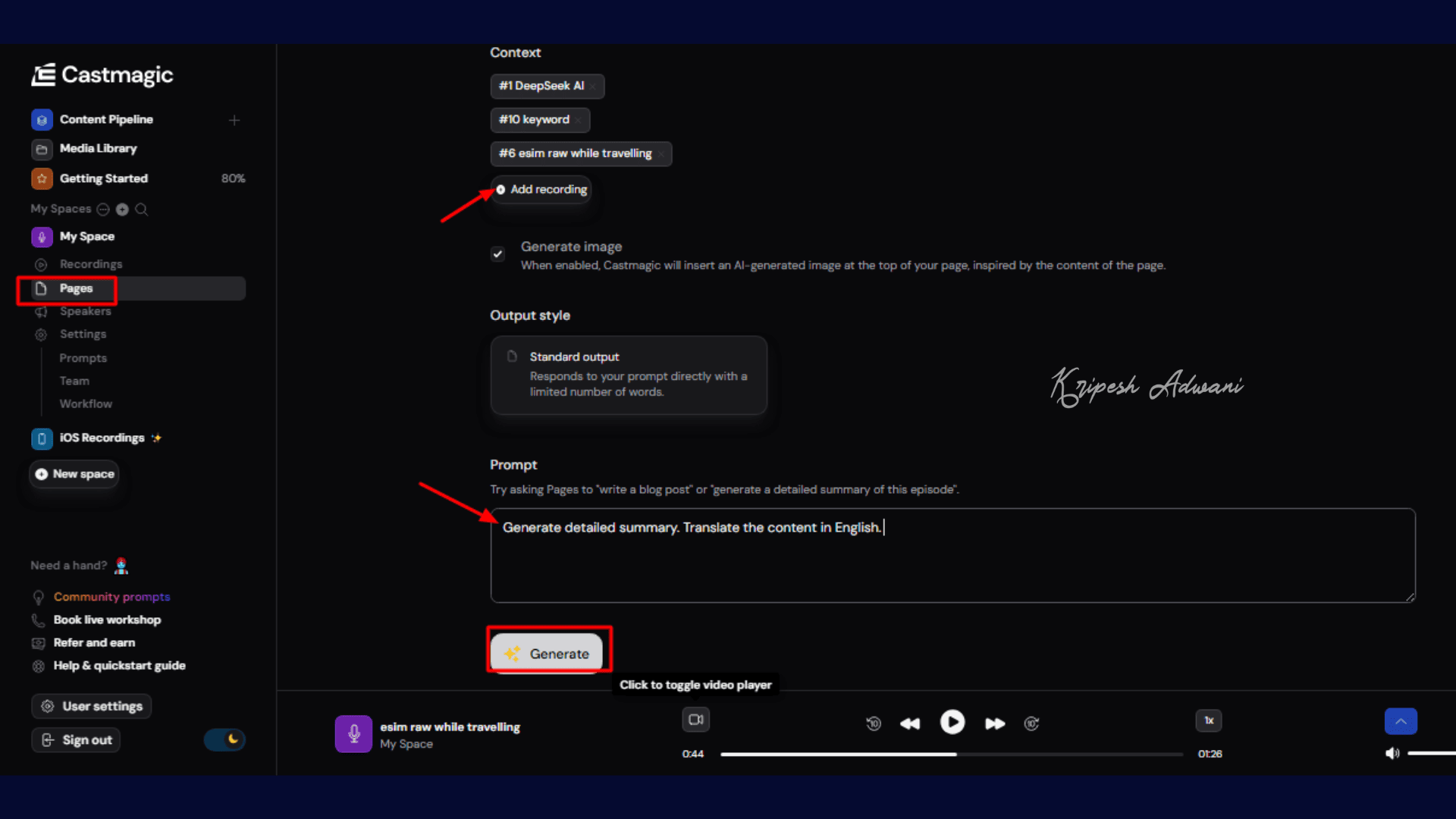 In the example above, I uploaded three recordings on different topics. As the default video language is Hindi, I requested a detailed summary in English. The output was brief and to the point, but it remained in Hindi. CastMagic was unable to translate the content in Pages.
