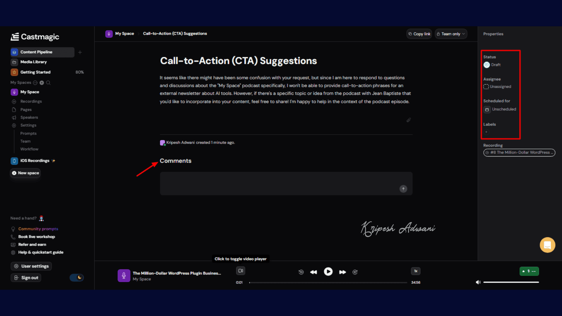 For better communication, you can add comments and tag team members. This feature is helpful for managing content workflows with status updates and collaboration. But the scheduling function is ineffective as CastMagic does not integrate with social media or other platforms.