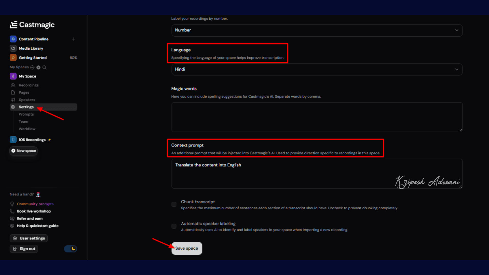 A key thing to remember: When setting the default language for a video in the context prompt, choose carefully. If you select Hindi for a Hindi-to-English transcription but upload an English video, CastMagic will still consume credits. The tool does not automatically detect the video’s language.
