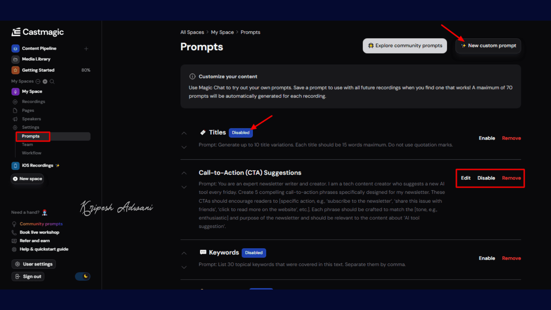 I found the custom prompt feature valuable as it allows for personalized content output. Otherwise, CastMagic generates generic content when no custom prompts are selected.