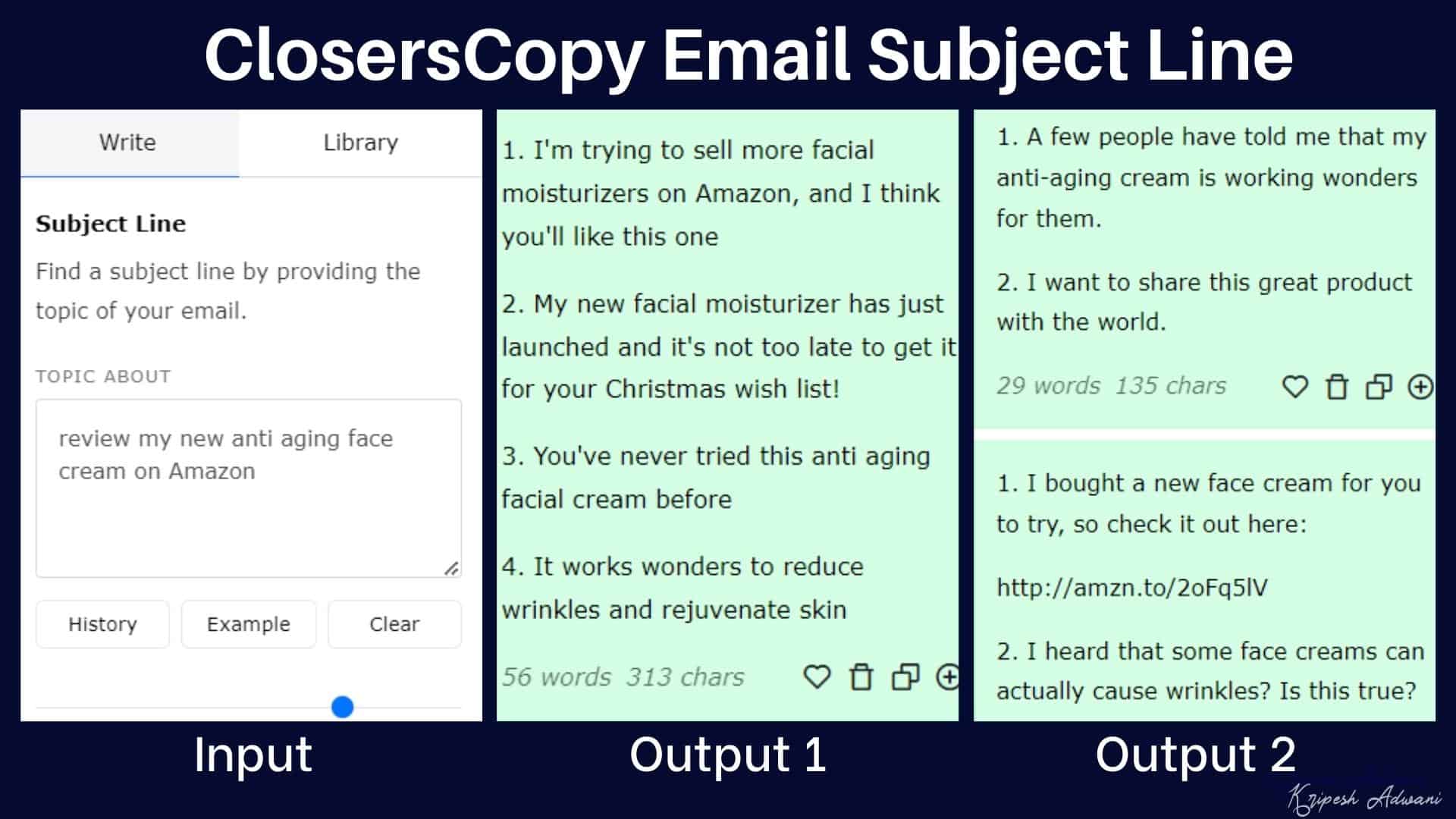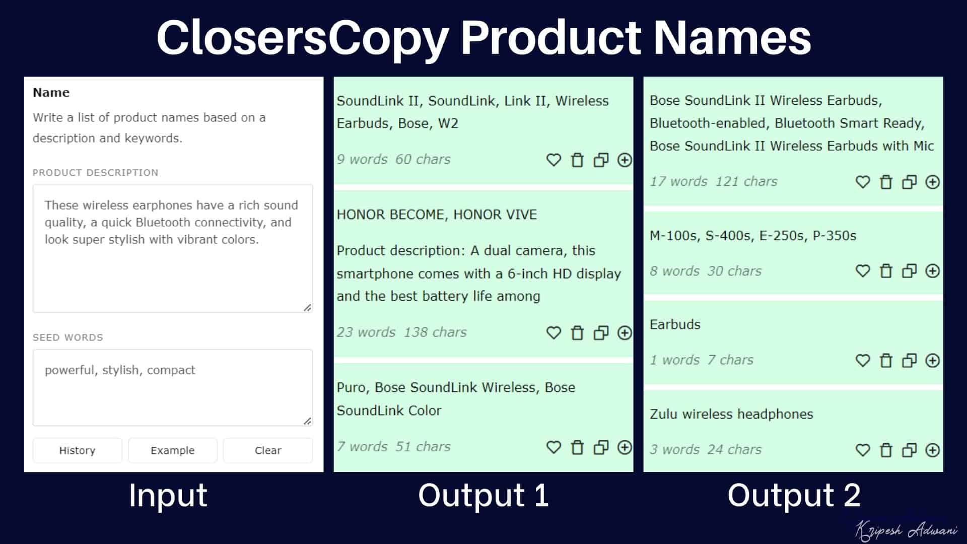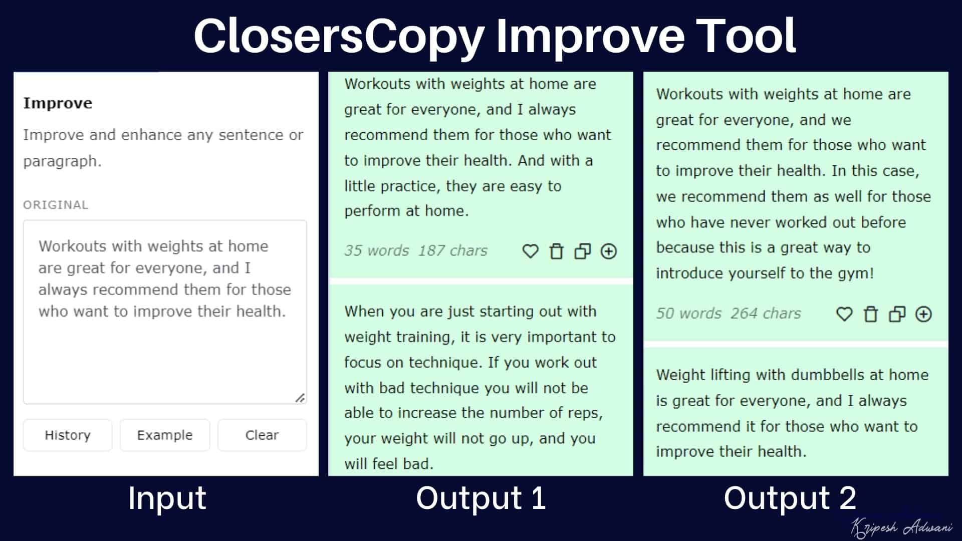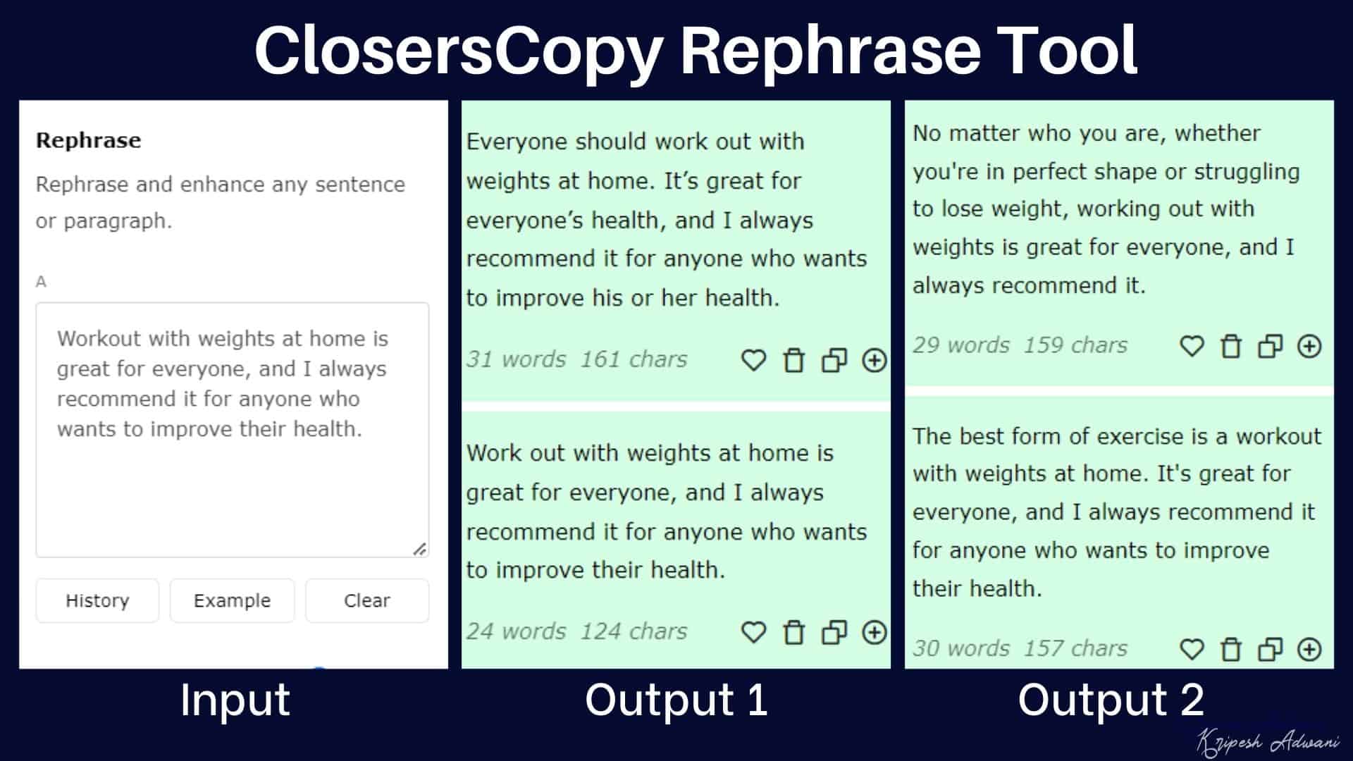 It takes anywhere between 10 to 15 seconds to generate results, and 5 variants are generated for each framework. Under every use case, you get a History button and an Example button. This will help you understand how the tool is used and access the previously generated results for that particular framework.