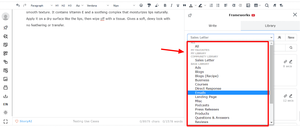 ClosersCopy helps you generate content in various categories. The Frameworks can be accessed from the Frameworks tab on the left panel.