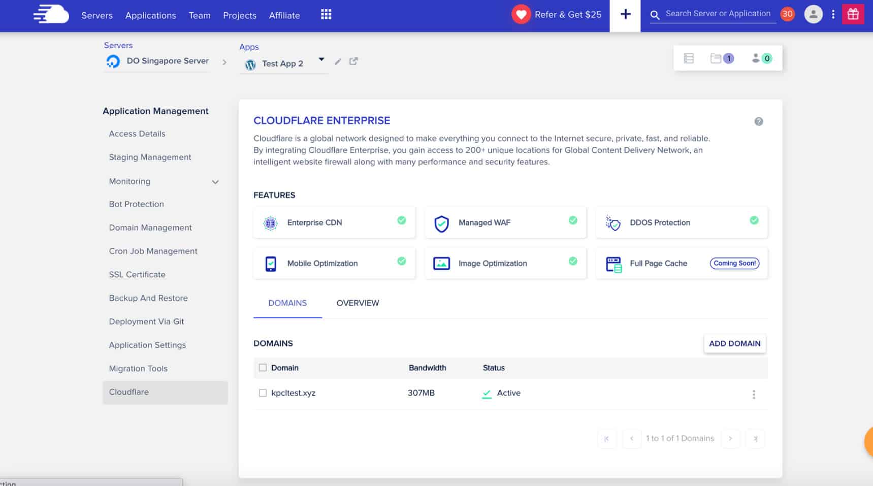 Now, once you activate the Cloudflare Enterprise on your Cloudways hosting, the Cloudflare option can be found under Application Management in your dashboard.